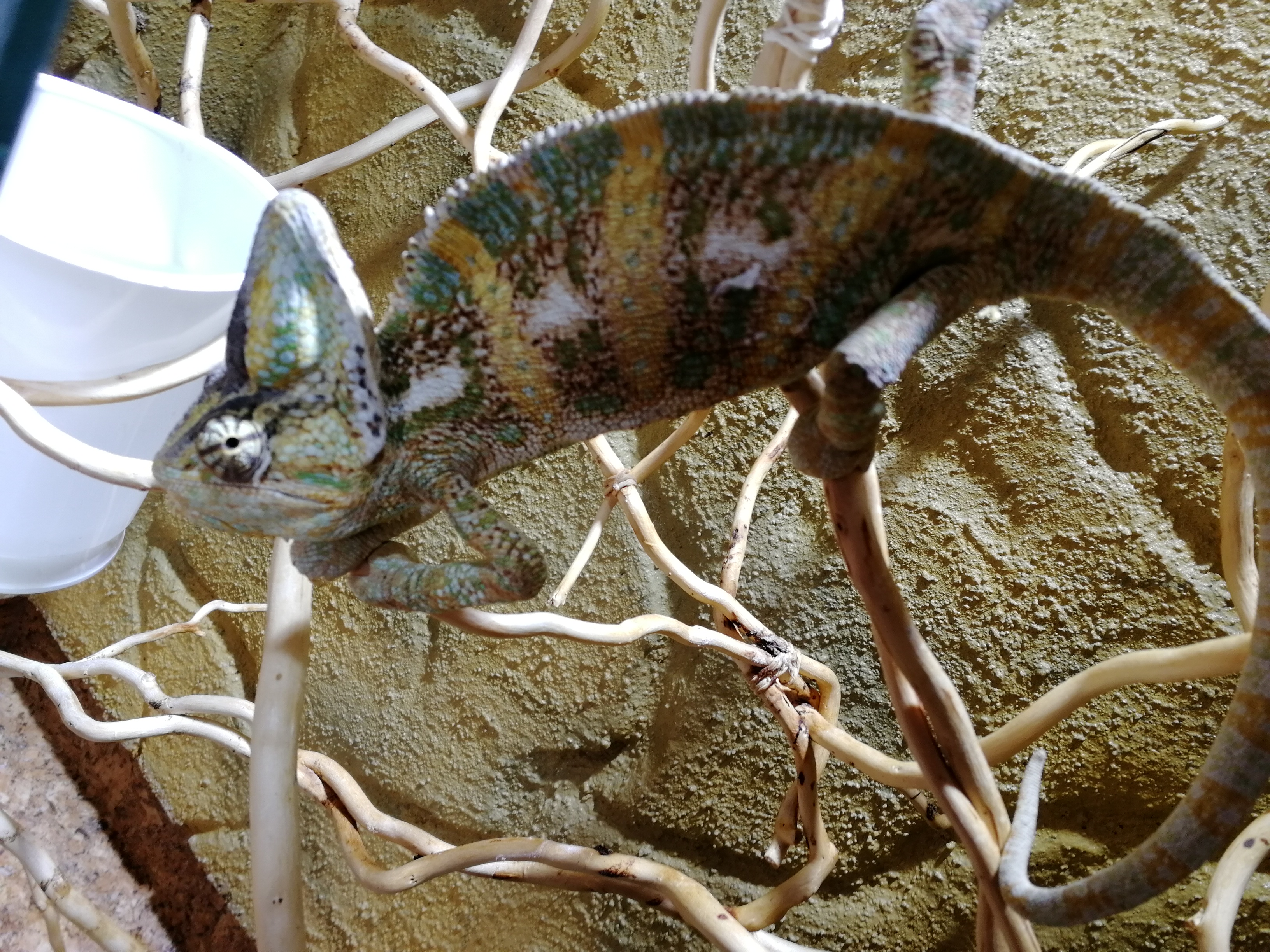 Dobrý den máme chameleona jemenského již 3 rok. Poslední měsíc má problém z vystřelováním jazyka. Vyplázne ho maximálně na 1cm. Musím mu dávat cvrčky z ruky jinak by se nenajedl. Terárium má rostlinu kterou 1x denně rosíme. Jako zdroj světla a tepla slouží výbojka sunlux (jedná se o nejkvalitnější světlo pro plazy podle informací) která je pravidelně 1x ročně měněna. Jako vápník dostává namletou přirodní sépiovou kost 5x týdně a 2x týdně roboran H (měl jsem i roboran pro plazy). Kromě jazyka chameleon nejeví žádné jiné známky choroby. Vůbec nemám tušení čím může být způsobena jeho disfunkce jazyka.