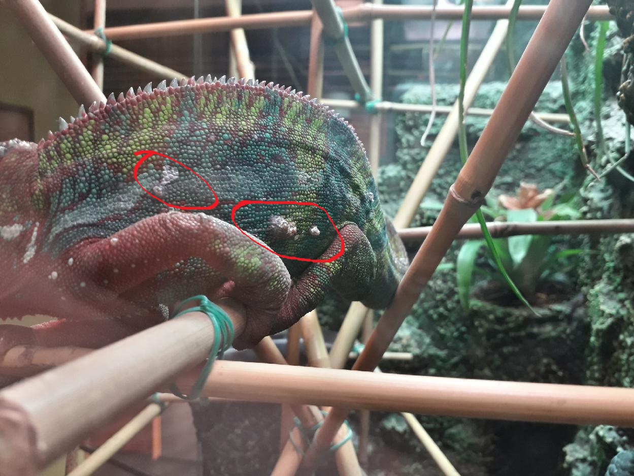 Dobrý den, mám na Vás dotaz ohledně zdravotního stavu chameleona, kterého mám něco přes 1 rok. Za posledních pár měsíců se mu dělají na kůži takové malé výrůstky (viz foto v příloze), nevím z čeho to může být, nerad bych něco zanedbal. Jeden už mu upadl, to jsem si myslel, že je zranění od větve, ale dělají se mu další. Osvětlení má vhodné, UVA i UVB, žárovky pravidelně měním. Krmen je sarančaty (2-3 denně), která jsou obalována vápníkem, 1x týdně ve vitamínech. Velikost chameleona i s ocasem 41 cm, stáži cca 13 měsíců. Nevíte, co s tím? Jestli mu něco nechybí nebo zda nemám navštívit veterináře. Děkuji za odpověď. S pozdravem Michal Rejthar