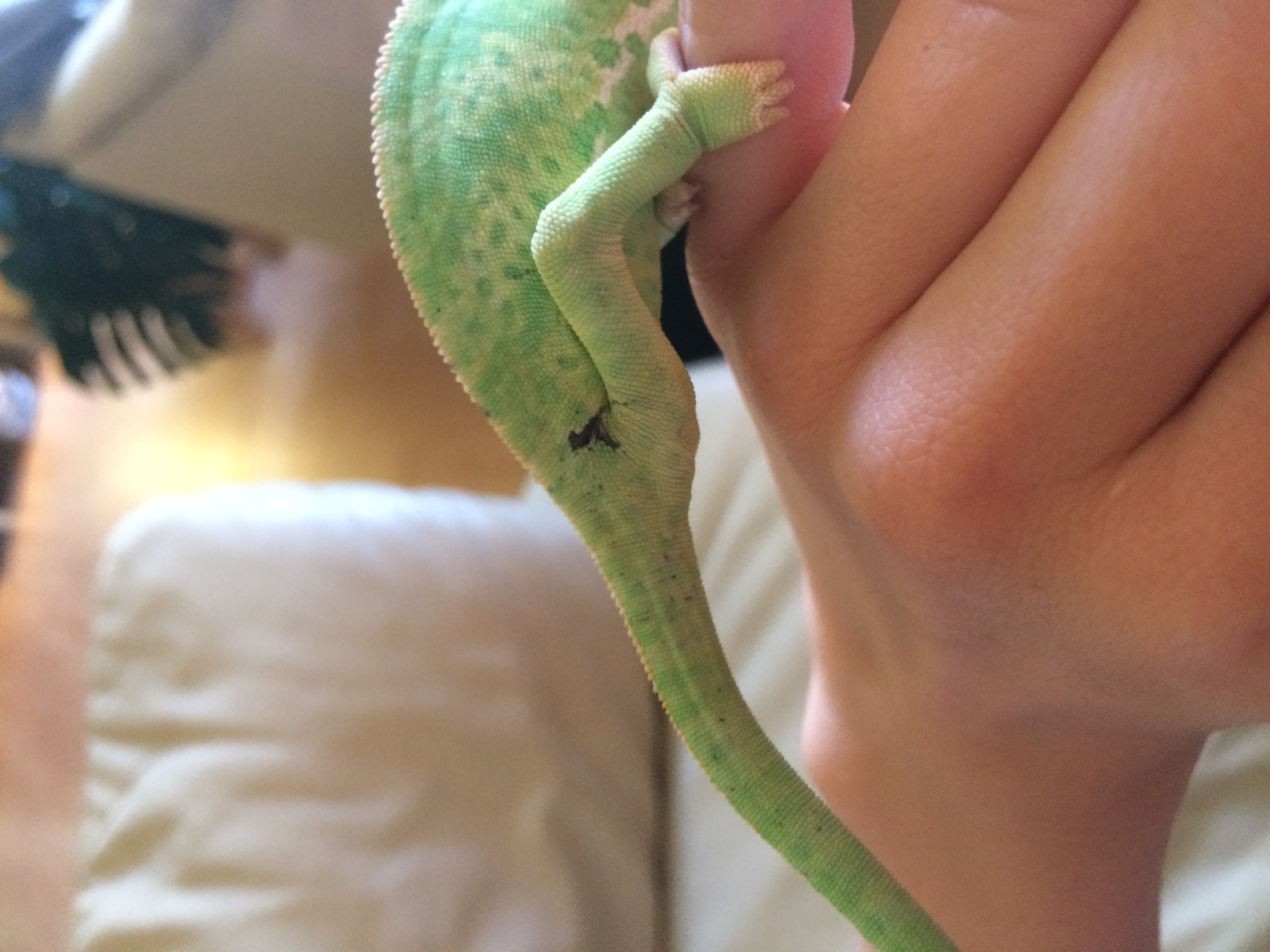 Dobrý den. Zřejmě jde jen o hyperpigmentaci šupin, tj. zvýšené ukládání barviva do šupin. Může to být následkem hojení poranění, po špatném svlékání (nízká vlhkost), teoreticky v důsledku překrmování vitamínovými přípravky. Pokud je chameleon jinak aktivní a přijímá potravu, nevěnoval bych tomu pozornost.
