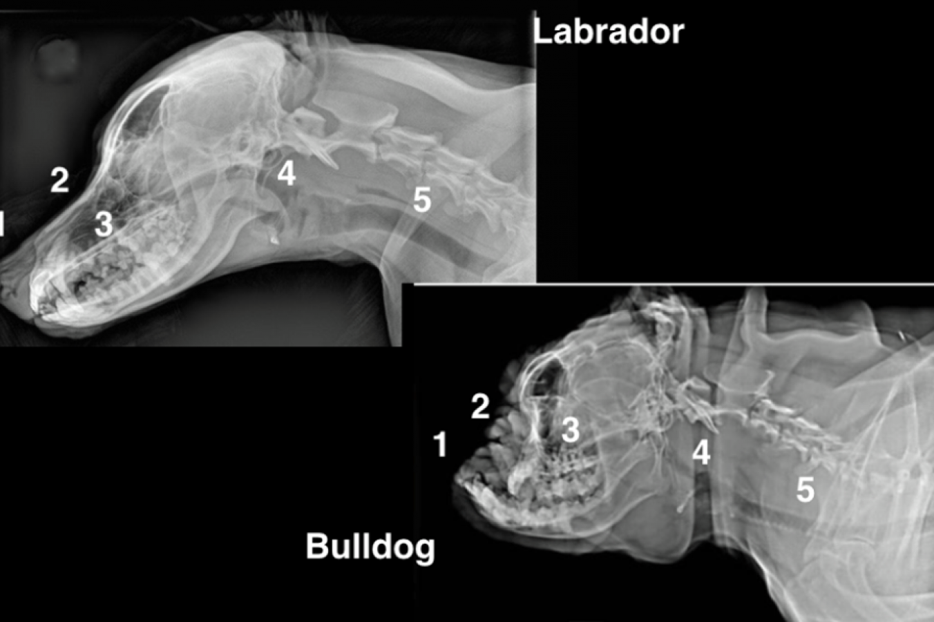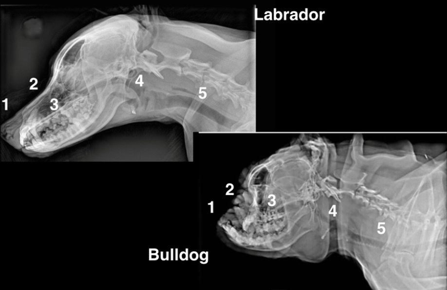 4) Na rentgenovém snímku je vzduch černý, měkké tkáně světlé a kosti bílé. Porovnejte rozdíl v množství vzdušného prostoru na horním spodním snímku – labrador vs. buldok. Krátkolebá plemena jsou v této oblasti značně omezena, proto tolik chrochtají a chrápou.