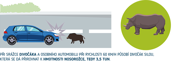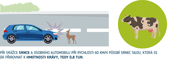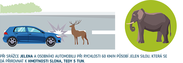 Pokud autem narazíte do urostlého jelena rychlostí 60 km/h, dá se tato srážka přirovnat k srážce s dospělým slonem, tedy s hmotností 5 tun.