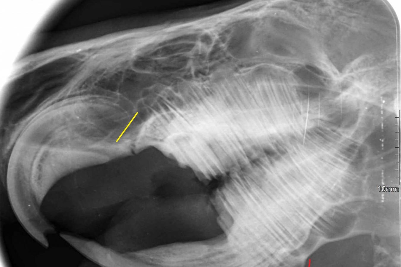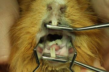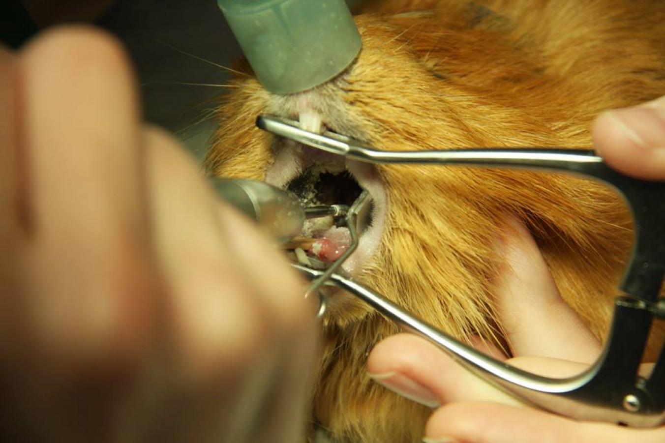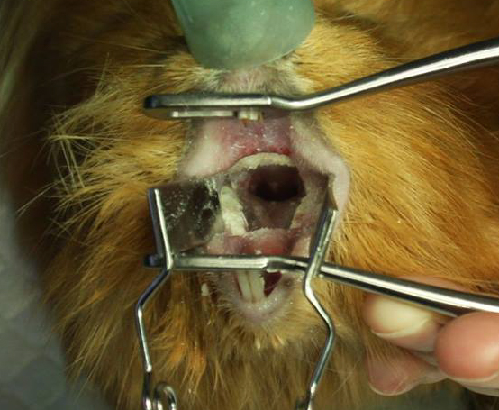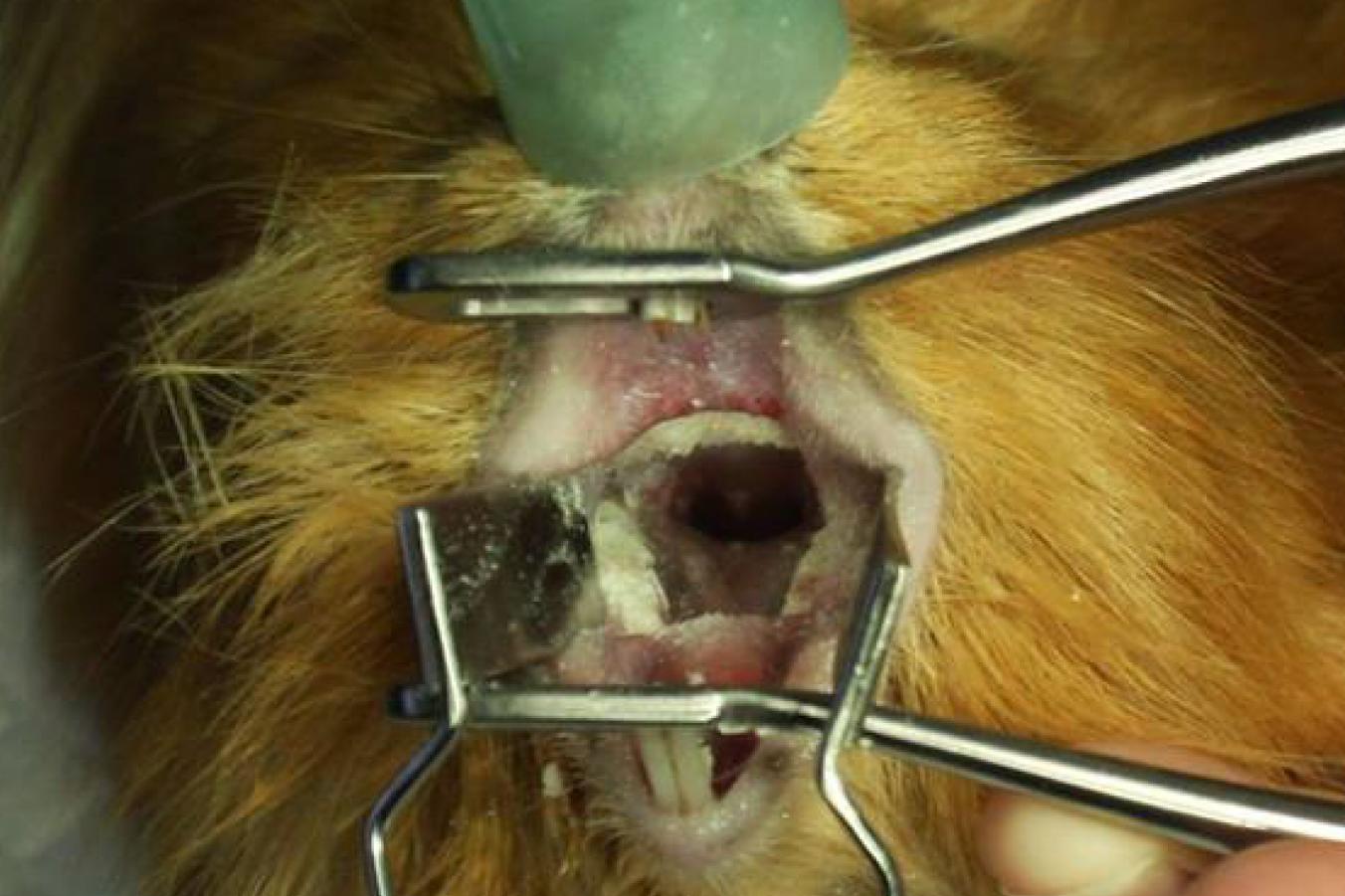Krácení řezáků se provádí diamantovým kotoučem, broušení stoliček se provádí zubní frézkou s vrtákem. Na fotce vidíte extrémní příklad přerůstání chrupu, kdy spodní stoličky přerostou přes jazyk a vytvoří tzv. mostek, který úplně znemožňuje příjem potravy. Pokud přerůstají korunky stoliček v tlamě, dá se předpokládat, že budou přerůstat i jejich kořeny v kosti. Prokázat to lze rentgenologicky a kromě terapie bolesti se s tím bohužel nedá nic dělat.