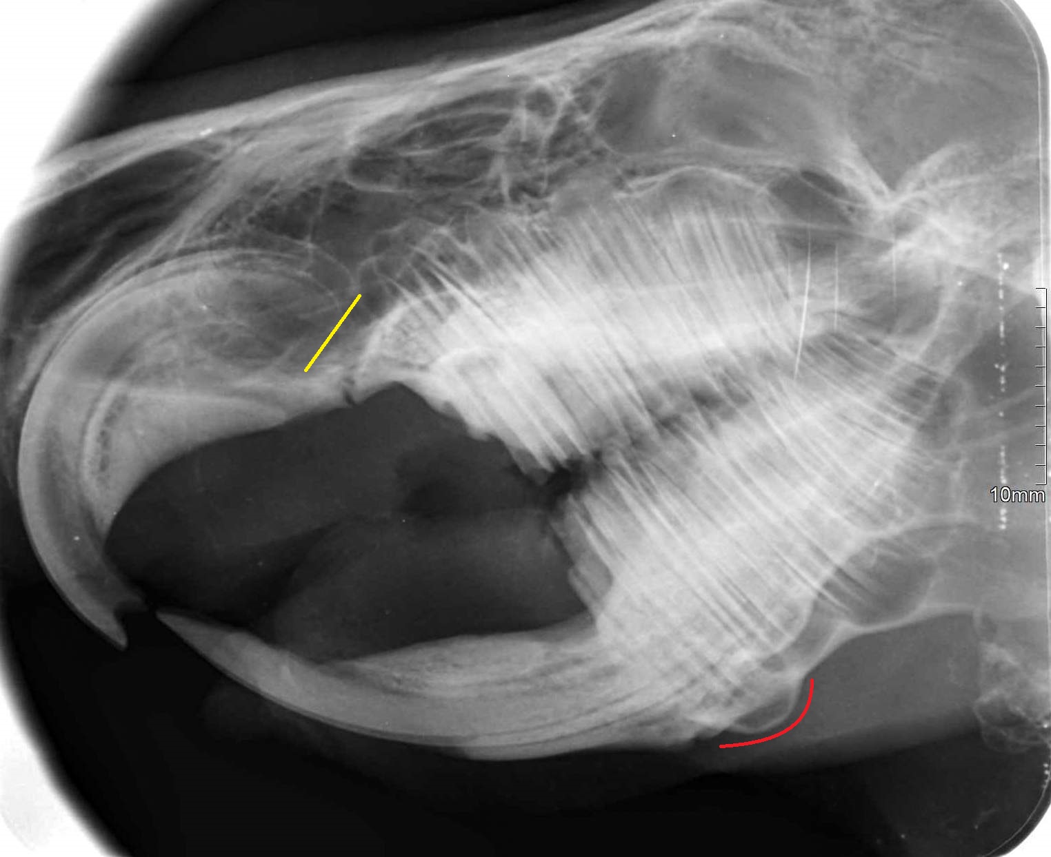 Žlutou barvou jsou vyznačeny konce kořenů řezáků, červenou barvou přerůstání kořenů stoliček v čelisti