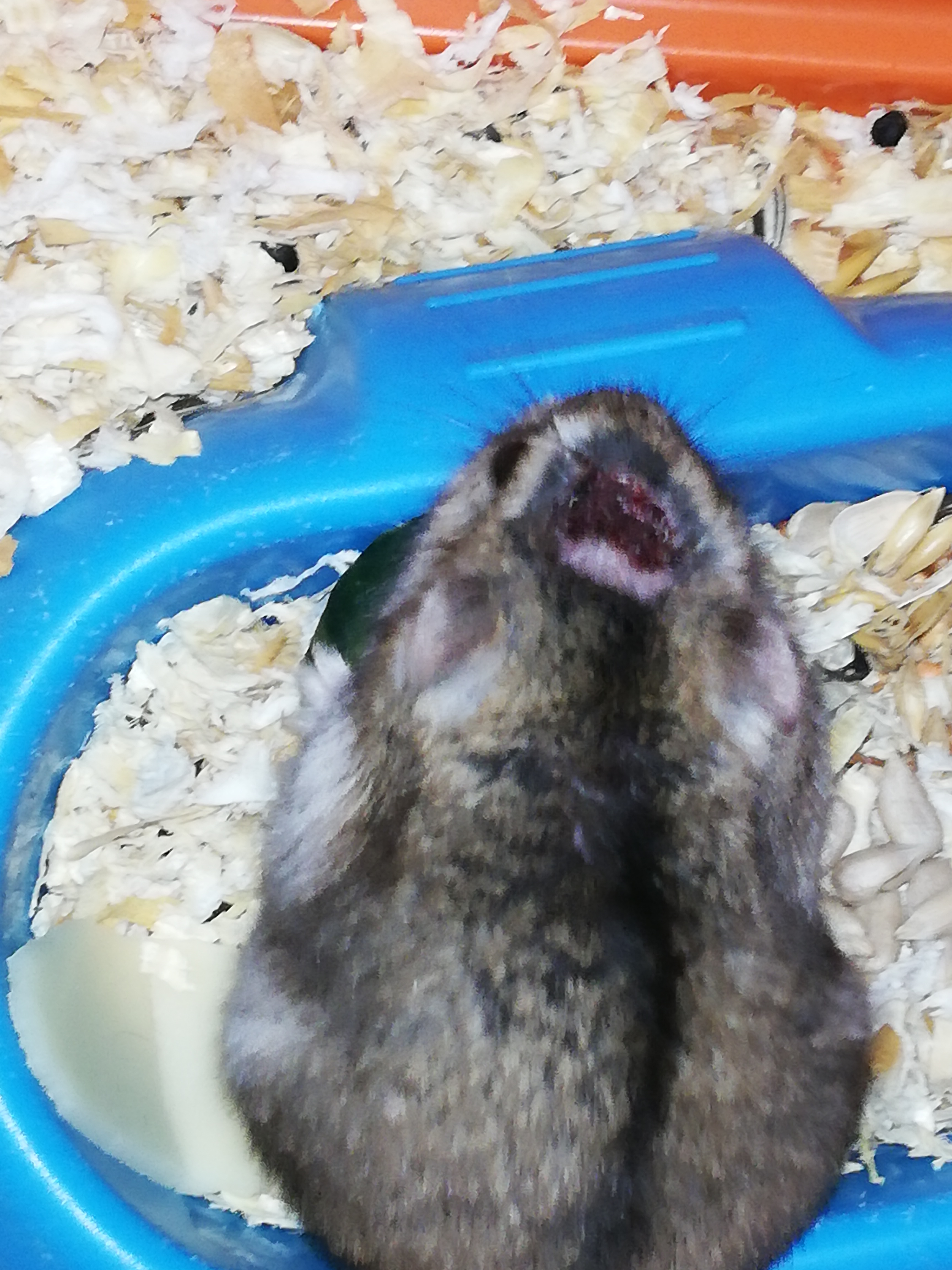 Dobrý den, náš křeček nemá na kousku hlavy srst, má tam takovou díru, a uvnitř je krev. Normálně běhá, spí... Zahojí se to samo?