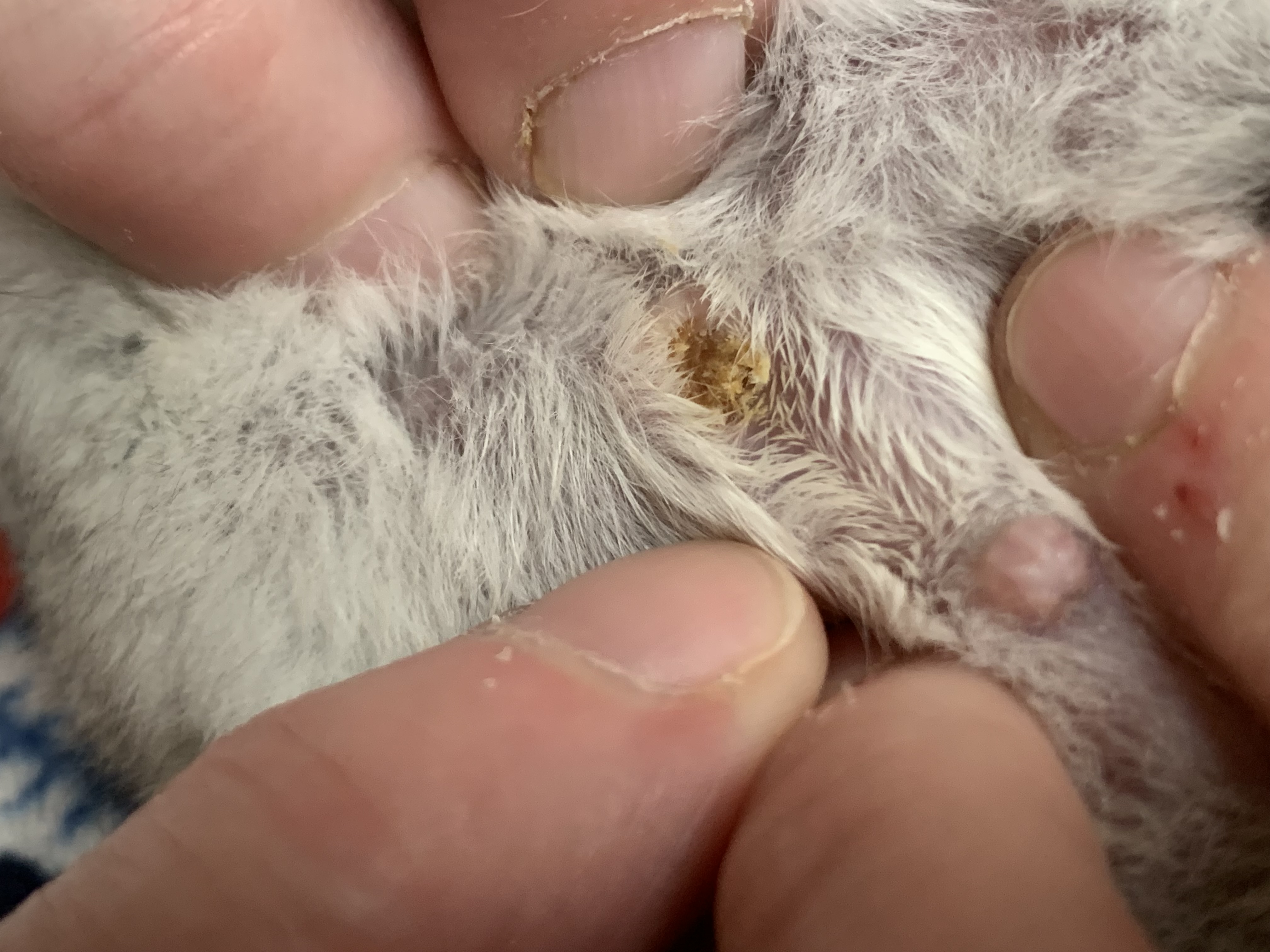 Dobrý den. Může to být strup po mikrobiálním přemnožení . Můžete to vyplachnout chlorhexid.samponem.S pozdravem MVDr Jančík.