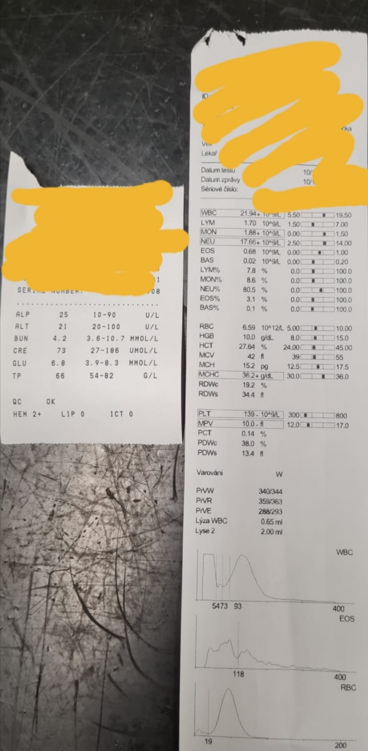 Dobrý den, chtěl bych poprosit o druhý odborný názor. Máme 8letého útulkového kocoura, který byl celý život neurotický, v průběhu let prodělal jeden generalizovaný a několik fokalních epi záchvatů. Stresoval se téměř ze všeho. Navíc měl určité stereotypy, mimo které nebyl schopen fungovat. Mimo domov ( na zahrade) pak byval casto dezorientovaný a zmatený. Dále měl postupem času velmi mnoho lupů. Jeho dalším charakteristickým znamením byl tzv. orlí nos, skobička atypická pro kočičí nos. V minulosti při návštěvě veterináře měl vždy laboratoř v referenčním rozmezí, pan veterinář se pak přikláněl k tomu, že se spíše jedná o nějaký vrozený syndrom.( ještě dodám, že byl asi poloviční velikosti normálního vzrůstu kočky domácí.) Tolik k anamnéze. Posledních 14 dní začal kocour kálet před záchod, zkoušeli jsme měnit stravu, ale problém byl jinde, včera jsme si všimli, že má na břiše hmatný ascites a celkově je jinak vyhublý více, než dříve . (Stále pije a jí, moč i stolice odchází pravidelně) Dnes jsme byly na veterině, kde mu byl udělán Uz, zaměřena teplota (- v normě) a základní laboratorní panel, ze kterého pan veterinář usoudil, že se nejedná o bakteriální zánět, poškození ledvin, ani jater. S největší pravděpodobností se jedná o virové onemocnění - nejspíše FIV, který je ale schopen verifikovat nejdříve v úterý, kdy mu odchází vzorky do externí laboratoře. A v podstatě nám bylo řečeno, že vzhledem ke stavu mu zbývají cca 1-2 týdny, a že v tomto případě již neexistuje žádná kauzální terapie. Punkce byla zamítnuta, protože by se mu tekutina udělala ve velmi krátké době znovu. Byli jsme odesláni domů. Chtěl bych se tedy zeptat, zda v tuto chvíli opravdu nechat kocoura dožít doma v tomto stavu, nebo se pokusit alespoň o symptomatickou terapii? Diuretika, punkci, Plasmaexpandery?. Takto mám pocit, že ho dříve zahubí zvětšující se ascites, než samotný virus. O diskomfortu nemluvě. V příloze přikládám dnešní laboratoř. Velmi děkuji za odpoveď.
