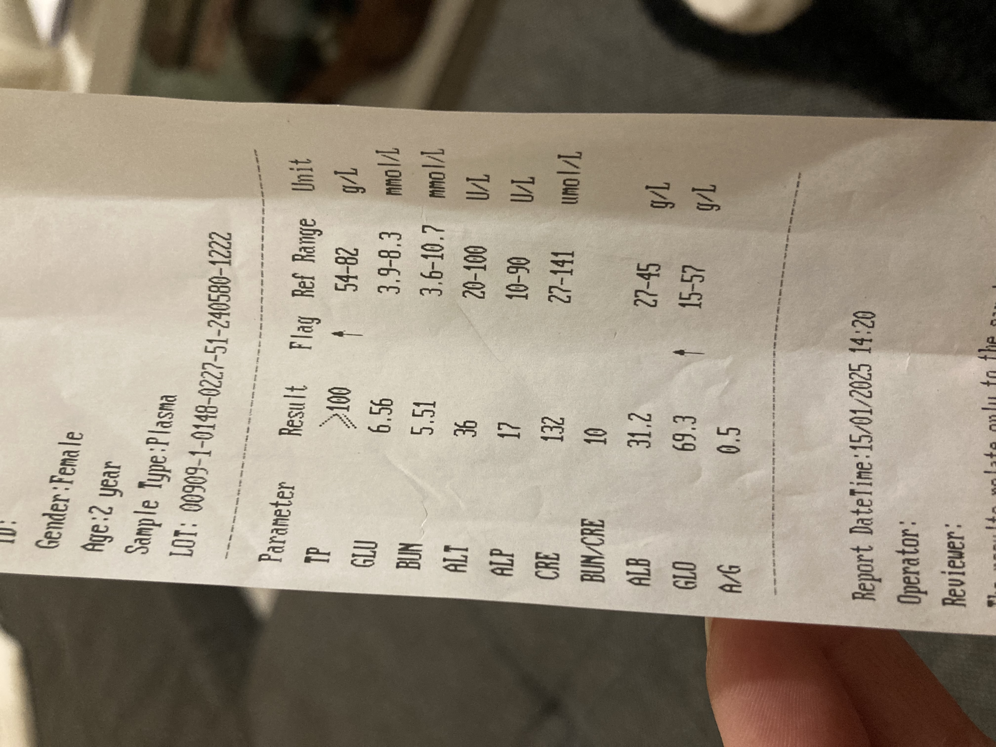 Dobrý den, všechny parametry má kočička v pořádku. Zvýšená je celková bílkovina, což je nález k té stomatitide. Celková bílkovina i globulin se zvyšuje při zánětu, což stomatitida je. Nejsou to ale nějaké šílené hodnoty. S pozdravem MVDr Orlovská
