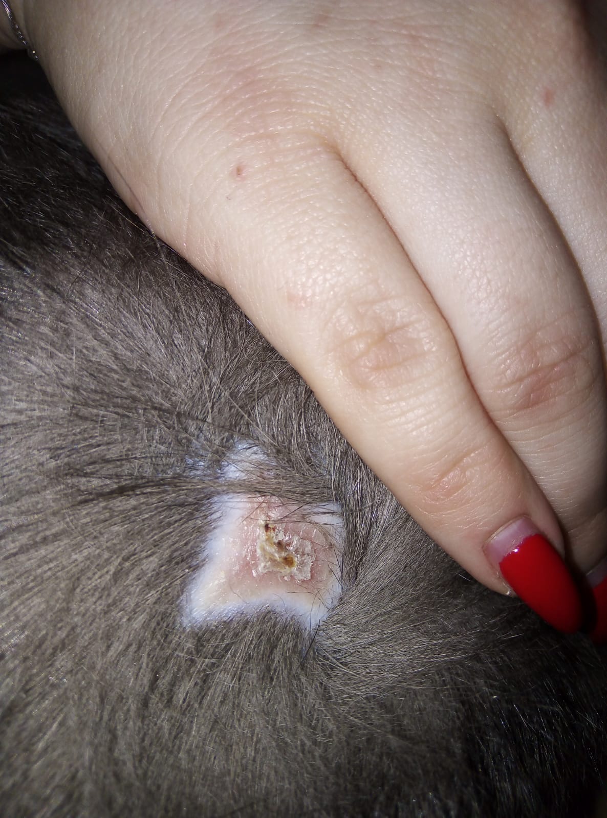 Dobrý den, prosím o radu. Dnes jsme na naši kočce objevili menší flíček o rozměrech 2x2cm, kde se její kůže odlupuje. Nevíme jestli je to něco vážného zda musíme jít k veterináři nebo to nic není. V této době se nám moc k veterináři chodit nechce, proto to nejdřív zkouším zde. Kočka byla v lednu na kastraci. A je to blízko místa, kde dostávala injekci. Přikládám foto