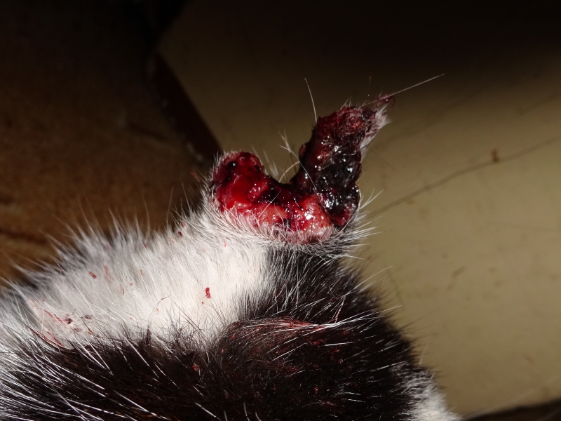 Dobrý den! Kocour, 13 let, skoro už asi před rokem začal mít strupy na uších, které si zadníma packami seškrabával, až do masa. Byl jsem s ním u veterináře, který konstatoval, že má (asi) v uších svrab a doporučil čistit uši propolisem. Manželka pracuje v lékárně a tak přinesla domů propolisový sprej. To nepomohlo. Další návštěva u veterináře. Uši, hlavně pak levé ucho, se zhoršily. Mnohdy z nich kape i krev. Ptal jsem se na antibiotika, řekl, že podstatou je, že si kocour ty strupy strhává. Doporučil kocourovi límec, který jsme poctivě kocourovi dávali. Asi tři týdny. Kocour i v límci zatřepal hlavou a strupy si takto i v lémci sundal. Denně jsme myli límec od krve a zkusili jsme "Akutol stop", který alespoň na chvíli krvácení zastavil. Po 14-ti dnech kocour přestával žrát a bylo vidět, že uši se vůbec neléčí, ani rány "nezavírají". Přestali jsme mu límec dávat a z kocoura se zase vyklubal veselý kocour. Žere, běhá, mazlí se, ale uši se neléčí. Na pravém uchu má už delší dobu strupy suché, levé ucho je však hrozné, viz foto. Ucho mu páchne, jako by uhnívalo. Ale kořeny uší si při mazlení nechává masírovat, drží a je na něm poznat, že mu to dělá dobře a nebolí ho to. Je mu 13 a půl roku a můj dotaz směřuje k tomu, jak kocourovi pomoci a jak odstranit popřípadě při jeho vyléčení, krvavé stopy po bytě, když si ucho zase a zase rozdrbe. Musím Vám přiznat dvě věci: už jsme rezignovali, kvůli jeho věku (i když bychom si přáli, aby s námi ještě nějaký čas byl) a také to, že jsem uvedl jiný kraj z důvodu toho, ža bych nerad, aby moji žádost o pomoc dostal do své poradny zrovna lékař, který nám v tomto problému moc nepomohl.