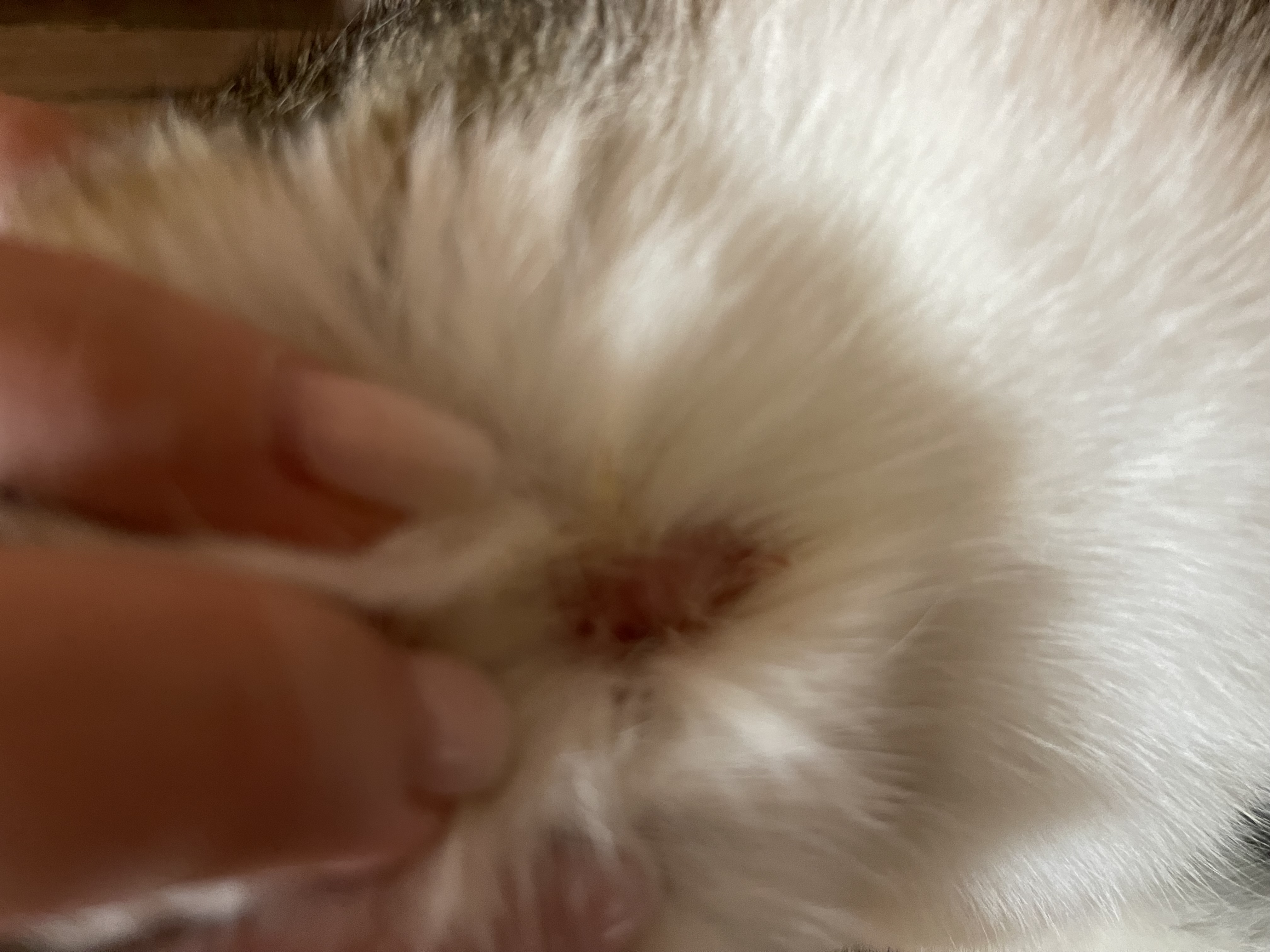 Dobrý den, vím, že z fotky toho moc nepoznáte, ale chtěla bych se zeptat, jestli aspoň trošku nebudete vědět co by to mohlo být. Na kočičce jsem to objevila náhodou, zkusila jsem ji to natírat naředěným Betadinem, ale přijde mi, že se jí to nelepší. Předem děkuji za snahu a odpověď. Tereza