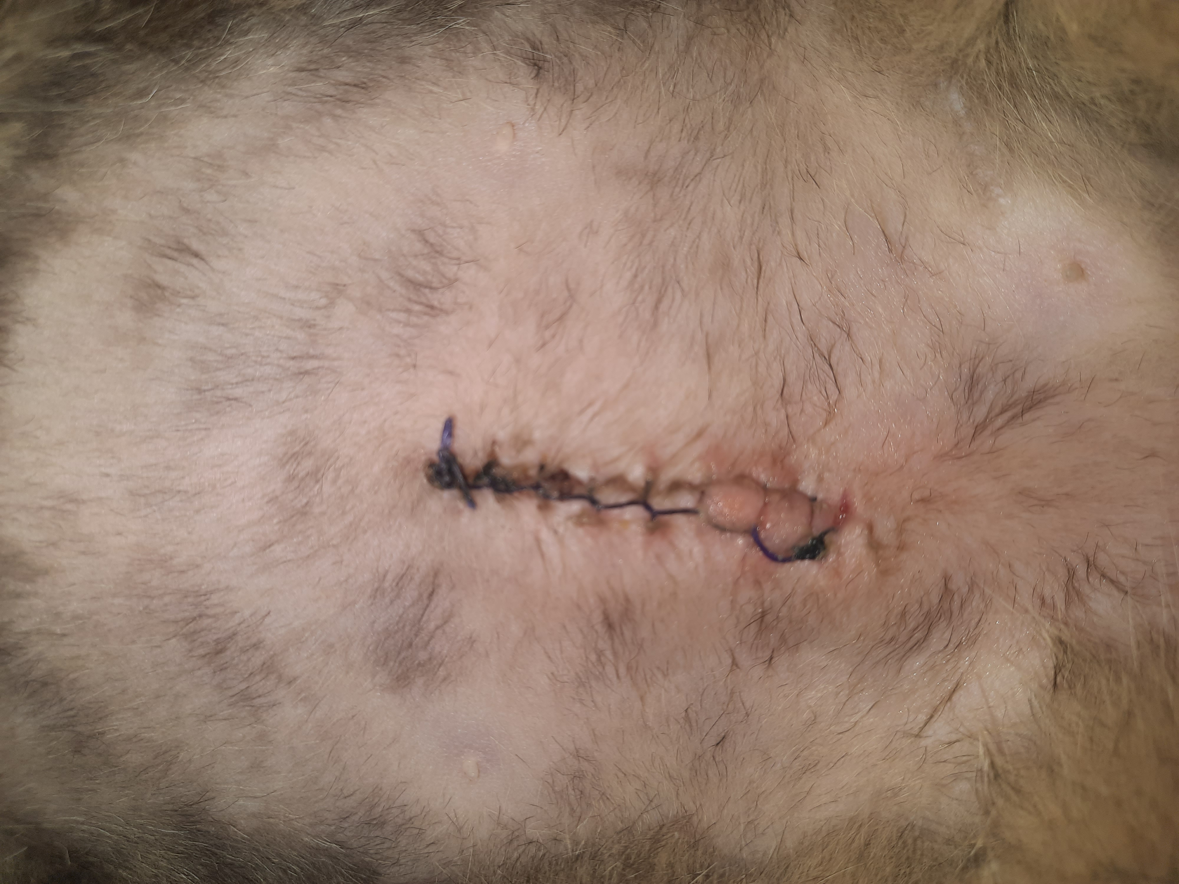 Dobrý den, kocourek byl mylně otevren kvůli podezření na nador, ale potvrdila se FIPka. Nyní je to 14 dnů po operaci a rána se mi nelíbí v dolni polovine..prijde mi jako kdyb hnisala. Potiram rapikem. Přikládám foto a prosím o názor co si o tom myslíte. Děkuji moc předem H.