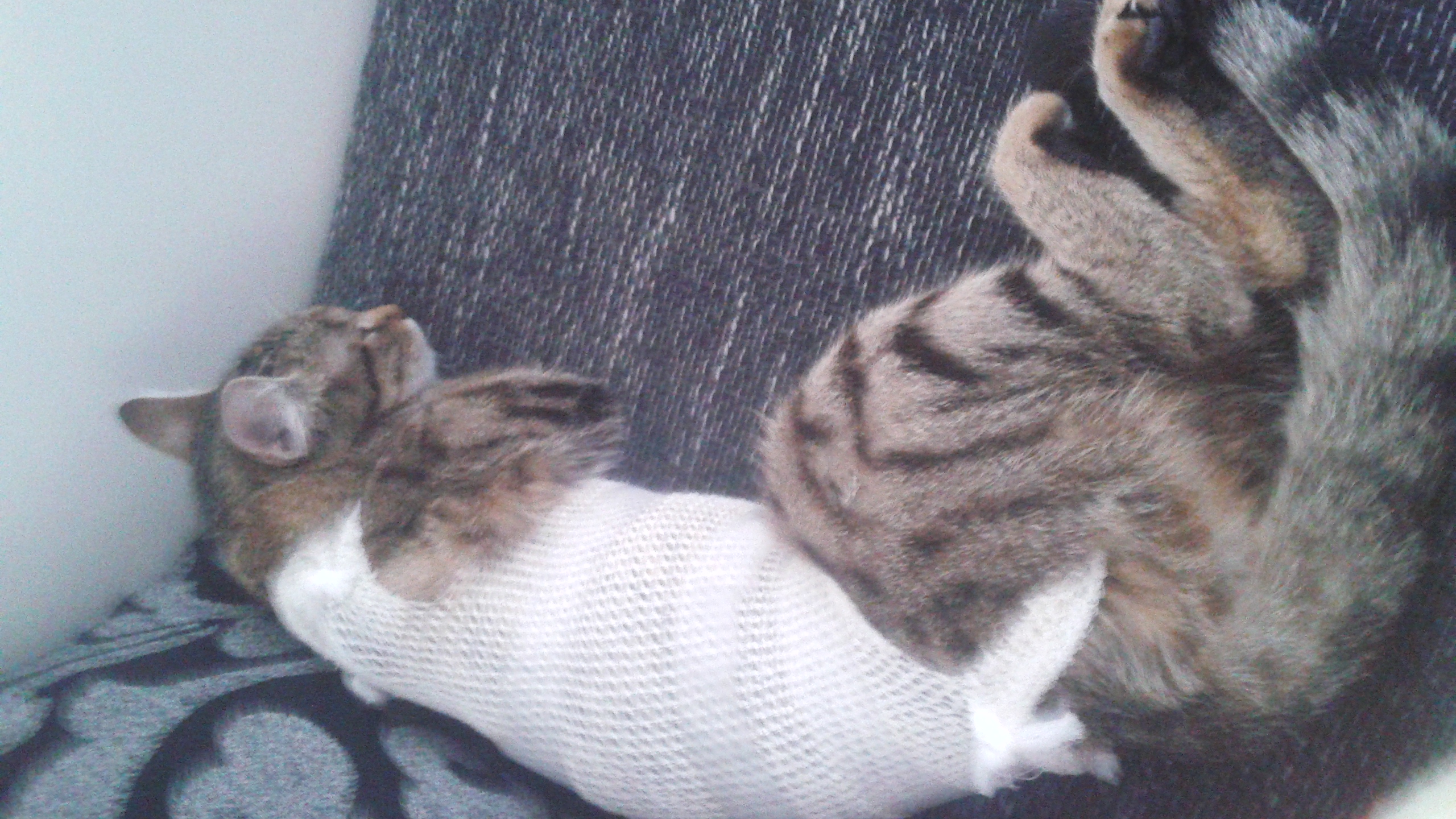 Dobrý den, kastrace kočky, pokud je prováděna jako preventivní výkon, je obvykle bez komplikací. Vámi popisované reakce mohou být způsobeny bolestí. Také nechápu, proč má na sobě takový obvaz, kočky si rány obvykle nevšímají a naopak jakákoli bandáž kočky hodně stresuje a nechtějí se pohybovat. Určitě zkonzultujte stav vaší kočky s veterinářem, který ji operoval nebo navštivte jiného. Kočky po kastraci se obvykle zotavují velmi rychle, do jednoho, max. dvou dnů. Pěkný večer, VŠ