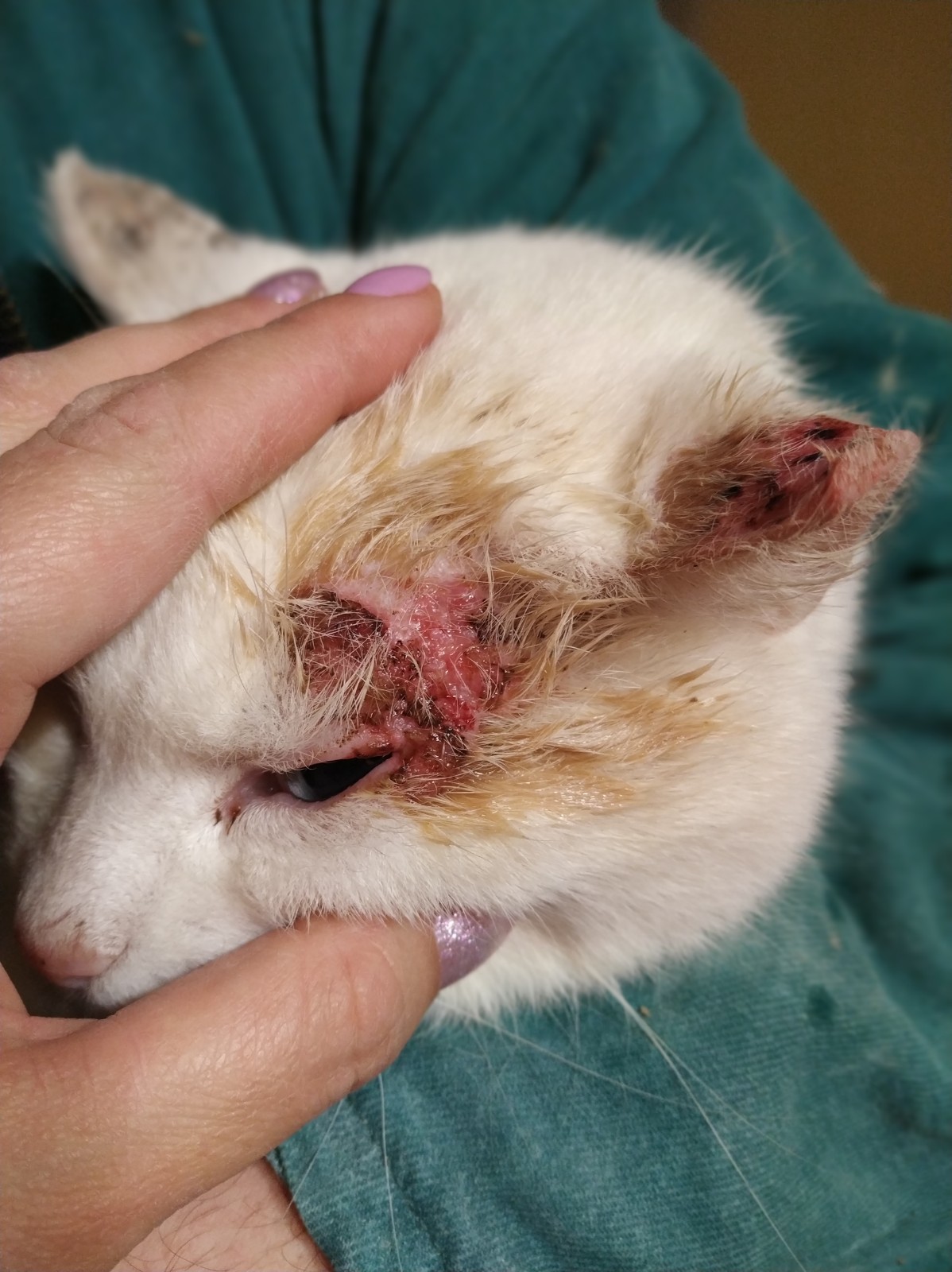 Dobrý den, z rodiny jsme zdědili 13 letého koucoura, který už měl pár let velký strup na hlavě, v oblasti nad levým okem. Zároveň měl strupaté i konečky uší. Strup na hlavě se nám stále nedaří zhojit, začínáme už být zoufalí. Jedná se o bílou kočku s modrýma očima. Za svůj život nedostával úplně špičkovou veterinární péči. Je to kočka, která bývá doma, i přes noc, ale s možností chodit přes den ven, po zahradě i dál. Kocour se dříve často rval, nevím, jestli ten strup byl pozůstatek nějakého zranění. Nicméně nedostával ani špičkovou stravu, často byl krmen i zbytky jídla. Dočetla jsem se, že bílé kočky mohou trpět různými nemocemi, zejména alergiemi. Jakmile jsme dostali kocourka do naší péče, hned jsme se mu snažili zajistit veškerou veterinární péči, vzhledem k věku podstoupil i extrakci zubů, kdy měl v problémy v tlamičce. S naší paní veterinářkou jsme spokojeni, zkoušeli jsme s ní strup léčit, nicméně zatím bezvýsledně. Sice už hlava vypadá mnohem lépe, ale nepřestává mě to trápit. Strup se mu na hlavě dělá stále. Zkoušeli jsme léčit antibiotiky, dostal je asi třikrát, plus speciální mast, ale ani to nezabránilo, aby se na místě netvořila nová a nová vsrtva strupu. Po radě paní veterinářky strup pravidelně sloupáváme, protože se tam tvoří opravdu hluboká a tvrdá krusta, pokud se to nechá více dní, která zasahuje i k oku. Kocourek v důsledku celé této "léze" má stále přivřené levé oko, má chycený i koutek. Mazala jsem ho už vším možným, měsíčkovou mastí, mastí od veterinářky, propolisem, teď zkoušíme speciální veterinární preparát čínské medicíny Audivet. Mažu mu tím i ouška. U těch uší jsem se dočetla, že bílé kočky mají méně chlupů na uších, a proto jsou často spálená od sluníčka, což byl pravděpodobně i jeho případ. Celé léto jsem mu mazala uši speciálním krémem pro děti proti slunci a pravé ouško se podařilo zhojita dokonce se obnovila i srst. Levé ouško také už vypadá lépe, ale ještě to není ono. Ale s tím strupem nad okem si stále nevíme rady. Proto se obracím na vás s dotazem, co byste doporučili a o co se jedná. Jedná se o alopecii? Naše paní veterinářka brala i nějaké vzorky ze strupu, ale postup byl viz jak jsem psala výše, tedy antibiotika, strhávat strup a mazat. Ještě měla podezření na alergii. Dostával i speciální krmivo, ale také bezvýsledně. Přikládám i fotku našeho problému. Děkuji moc za jakoukoliv radu.
