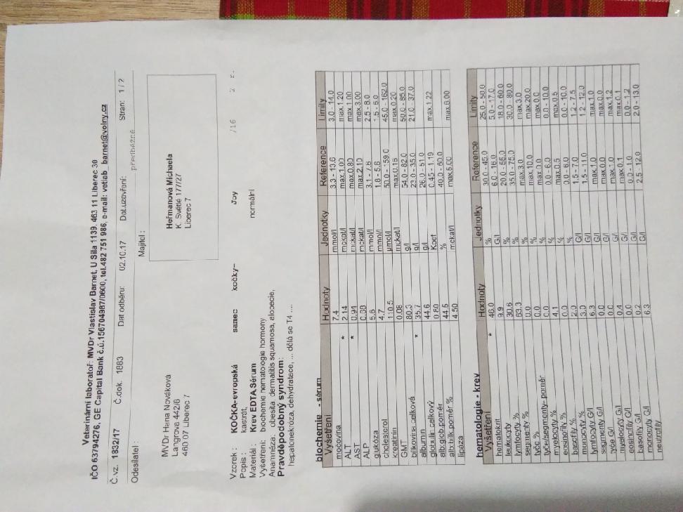 Děkuji za vyjádření, přeposílám výsledky rozboru krve, snad se ukáže. Jinak Joy hodně pil jeden čas, měl bílkovinu v moči, struvity, bolest kloubů a zad, náchylný na kočičí rýmu. Štítná žláza v pořádku. Je vykastrovaný. Děkuji za odpověď a prosím kdybyste mi doporučili granule, po kterých by příp. zhubl. Přeji hezký den. Heřmanová