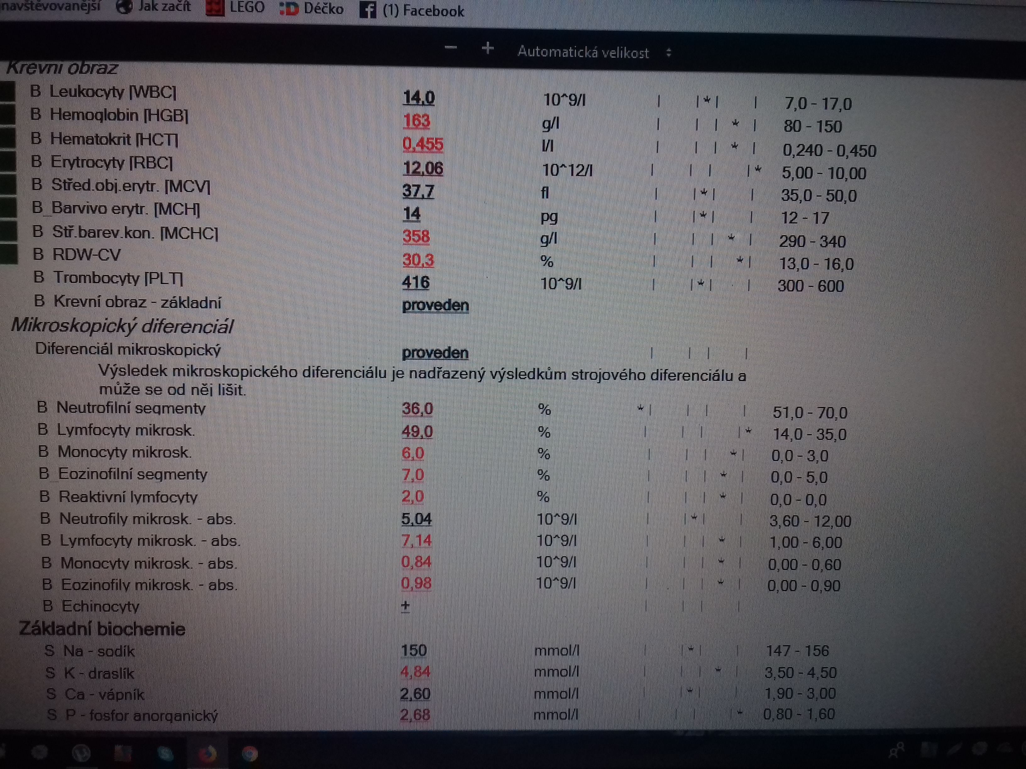 Dobrý den,pokud nebyla přeléčena antibiotiky (ideálně pro její věk úč.látka amoxicillin.klavulanát 20-25mg/kg 2xd, dobře snášené, bez vedlejších účinků, účinné), zvážila bych jejich nasazení. V krevním obrazu jsou určité změny, které by to opodstatňovaly. Např. výskyt reaktivních lymfocytů. Změny na ledvinách viditelné na ultrazvuku se zatím nemusely projevit v moči ani v krvi, ale určitě bych doporučila pravidelné preventivní odběry krve i moči, cca 2x ročně. V případě, že nejste finančně limitovaná, by pro vás bylo ideální referenční pracoviště zabývající se složitými případy, např. klinika Jaggy (Praha a Brno).