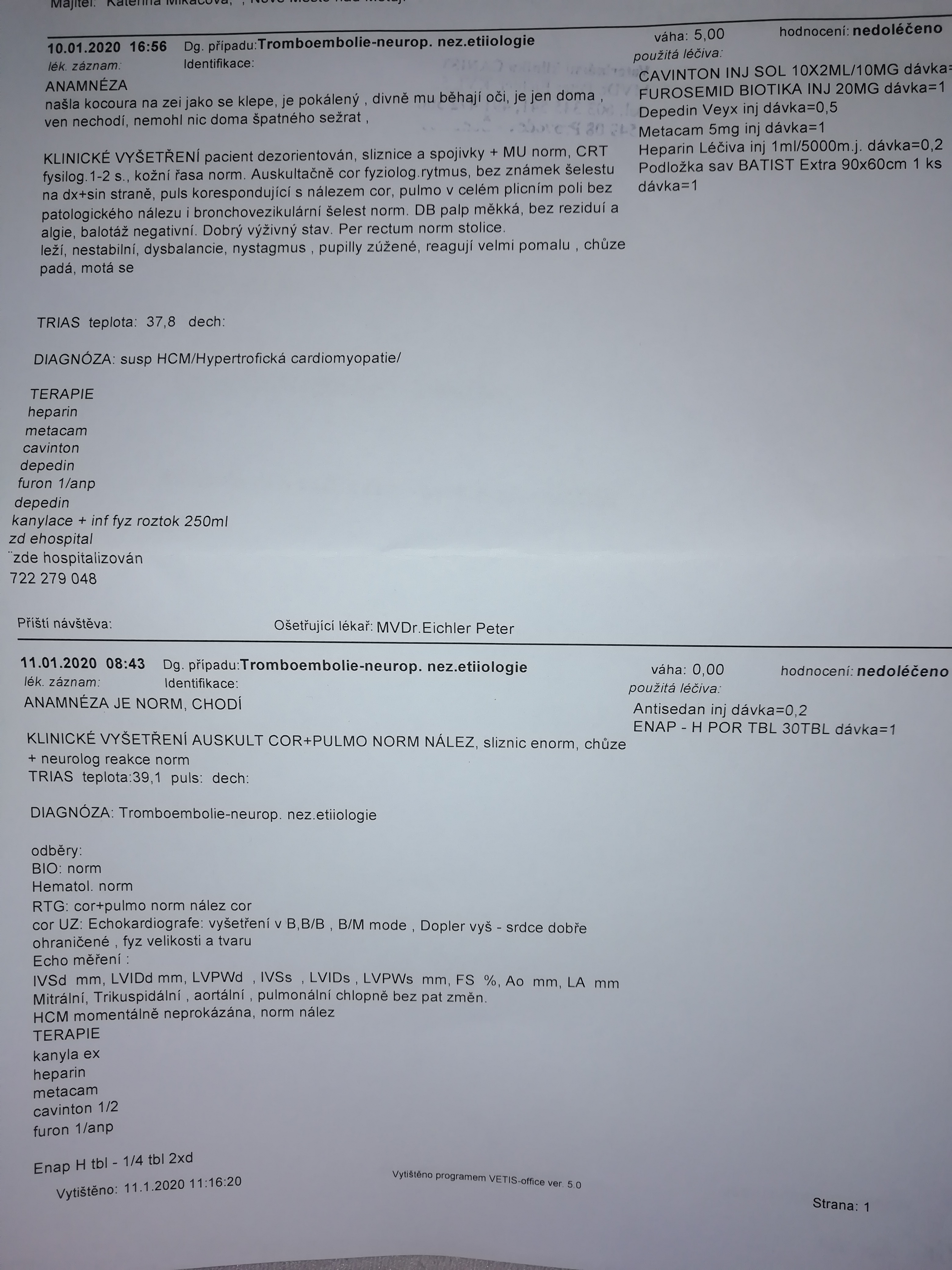 Dobrý den, našemu kocourkovi (Mainská mývalí 10měsíců) byla diagnostikována tromboembolie- neurop. nez. etiologie. HCM zatím neprokázáno, normální nález. Máme mu podávat heparin a má léky na srdce, biochemie a KO normální, teplota při příjmu 37,8. Dokázal byste mi říct, jaká je v tomto případě prognóza? Přikládám foto lékařské zprávy. Děkuji za odpověď a Váš čas. Hezký den.