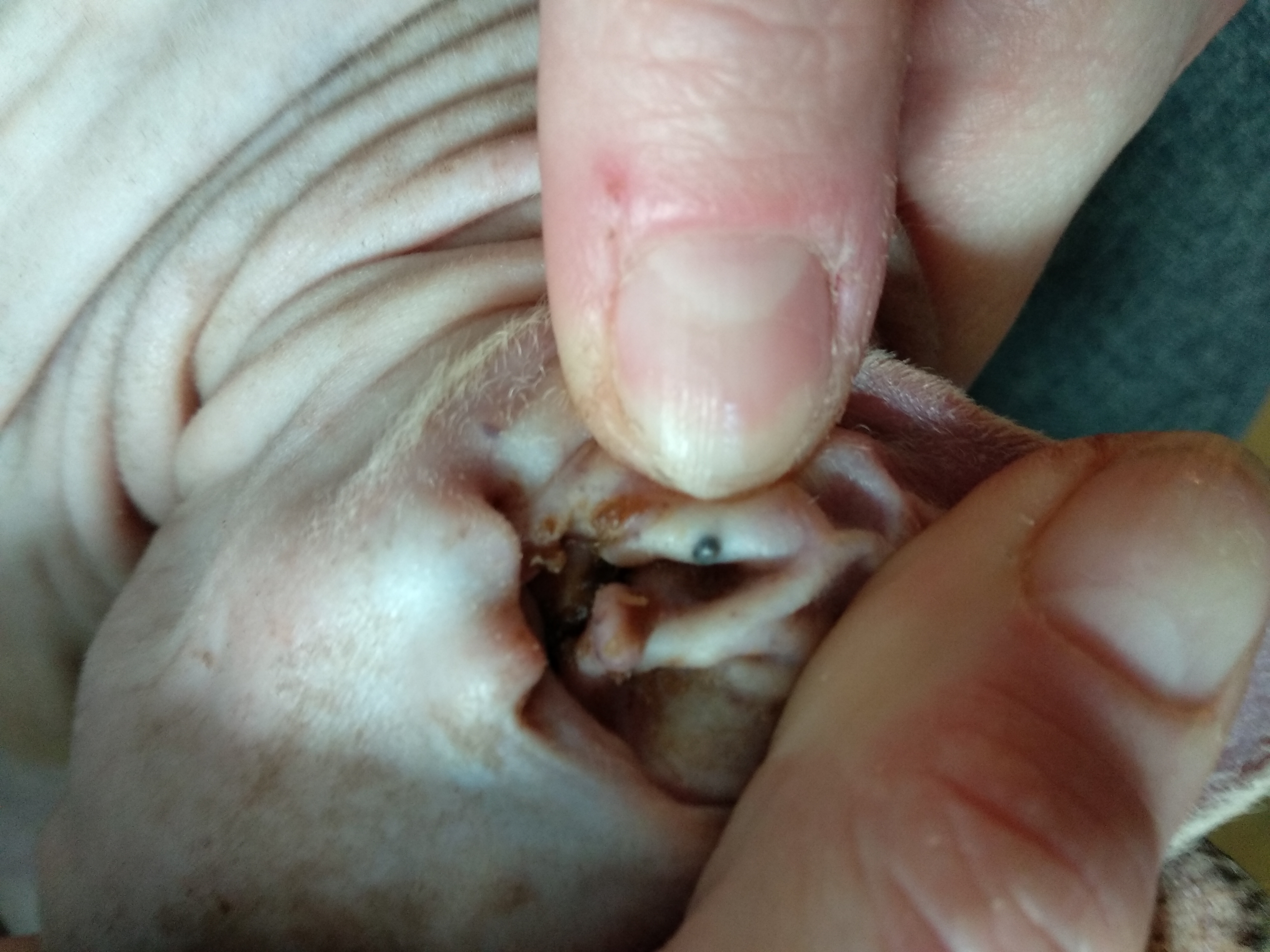 Vazeny pane doktore, mohu se zeptat, o co by se mohlo jednat, viz prilozena fotografie ? Objevilo se to u nasi 9ti lete kocky - sphynx v jednom uchu, je to tak 0.5 cm velke. Predem velice dekuji za odpoved.