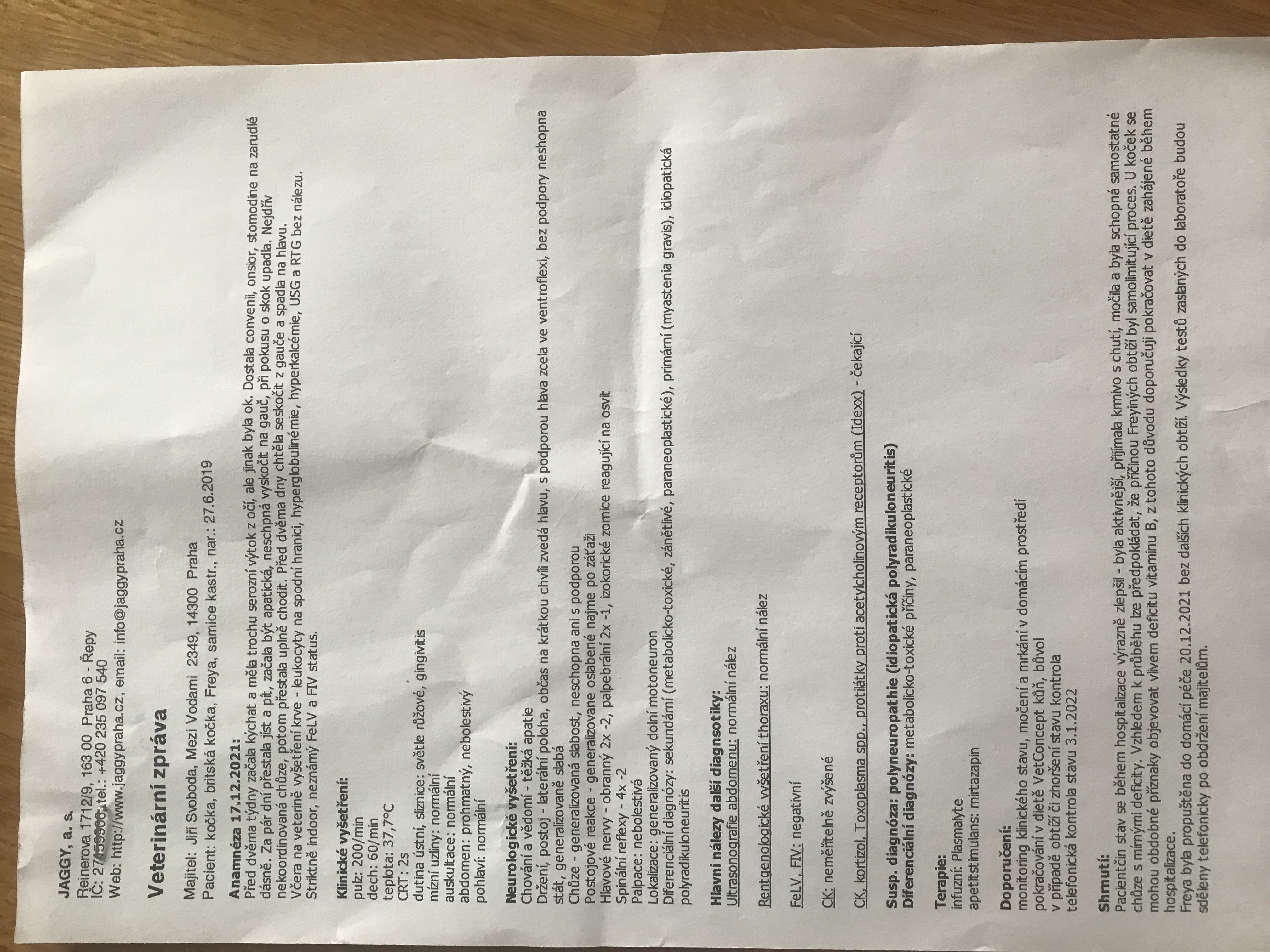 Dobrý den, obracím se s dotazem na naší 2,5 letou kočičku. Během prosince (2021) jsme u ní zpozorovali časté kýchání, šli jsme na klasickou veterinu na sídlišti, kde kočka dostala antibiotickou a protizánetlivou injekci (Onsior 20mg a Convenia) po asi týdnu začala být kočka špatná na zadní nožky, vždy udělala dva-tři kroky, sedla si nebo lehla na zem, druhý den začala být apatická, nejedla, nepila a vůbec na nás nereagovala, odvezli jsme ji na veterinární nemocnici na Libuši, kde jí následně prohlídli a odebrali krev a udělali sono, plus další testy, nechali si jí tam přes noc hospitalizovanou, ale druhý den beze změny, výsledky neukázaly nic závažného, co by se dalo léčit. Na doporučení jsme jeli na kliniku Jaggy, zde byla kočka hospitalizovaná 3 dny, kdy druhý den dostala posilující injekci aby se sama najedla a vykonala potřebu, další den tedy neděli nám bylo sděleno, že už je v pořádku a můžeme si v pondělí kočičku přijít vyzvednout, ani tady neukázaly laboratorní výsledky nic závažného, možné podezření na polyneuropatii nebo nedostatek vitamínu. Jedna z možností bylo udělat magnetickou resonanci, ale podle veterinářů by nezvládla uspávací injekci a nemusela by se probrat. Zakoupili jsme tedy přímo na veterině doporučené granule vetconcept-kůň, buvol. Po týdnu kdy kočka seskočila z postele opět stejný stav jako před návštevou veteriny, ihned jsme kontaktovali veterinu, po 3 dnech nám odepsali a doporučili zakoupit Neuromultivit. Kontaktovali jsme i chovatelku, ta nám vysvětlila podezření na FIP- suchá forma, po 5 dnech je kočka schopná sama se najíst, napít, dojít si na záchod, pohybovat se po místnosti, hraje si, ale bohužel stále se nedokáže sama postavit na zadní tlapky, už nevíme, kam jinam se obrátit a kam směřovat léčbu, už teď jsou to velké náklady pro nás a vlastně nevíme vůbec nic, proto budu ráda za každou radu, kterou nám poskytnete. Předem děkuji za odpověď Kopecká