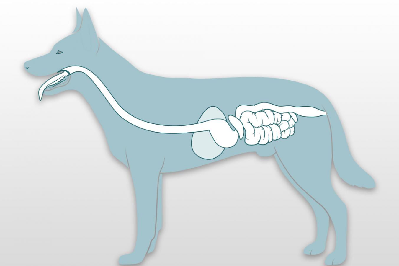Naprostá většina živin (cukry, tuky, bílkoviny) se vstřebává v tenkém střevě, kde dochází k chemickému trávení. Na trávení potravy se zde podílejí enzymy slinivky břišní a jater. K trávení potravy přispívají rovněž pohyby střev, které promíchávají jeho obsah. Do střeva přichází natrávená potrava ze žaludku a ve střevě se dále štěpí šťávami slizničních žlázek i šťávou břišní slinivky za pomoci silně zásadité žluče z jater. Štěpení napomáhá i střevní mikroflóra. Šťávy štěpí potravu až na základní složky, které pak sliznice vstřebává. Tlusté střevo se dělí na slepé střevo, tračník, konečník a řiť. Slepé střevo u psa je velmi malé a nevýznamné. Nezpůsobuje zdravotní komplikace v podobě zánětu, jako je tomu u lidí.