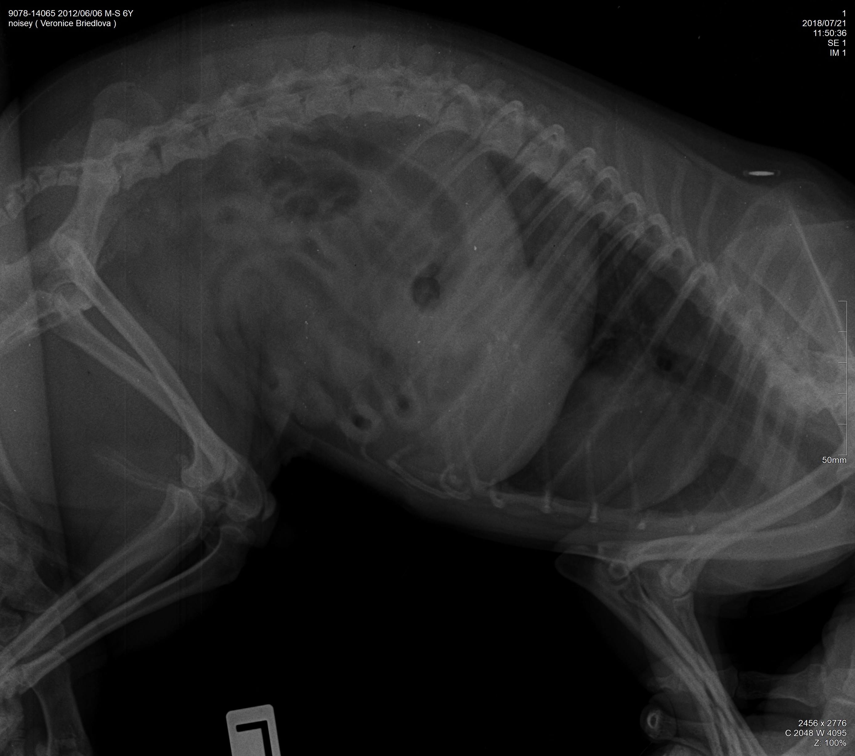 Dobrý den, můj pes 9kříženec čivavy 7-8 let, má již několik měsíců zvýšené jaterní testy (ALT 143 U/L, AST 64 U/L, ALKP 416 U/L), veterinář mi tvrdí, že to není nic hroznéh a ať zase přijdu na kontrolu za tři měsíce. Cca před 2 měsíci měl zvětšené bolestivé břicho, na základě toho mu byl udělán rentgen a diagnoza byla, že má hodně plynů ve střevech a dostal ATB. Pak se to zlepšilo, ale před dvěma týdny se mu to opět vrátilo. Znova dostal ATB. Dost jsem hledala na interentu a narazila jsem na acites. Je možné toto poznat z přiloženého rentgenu? Moc děkuji!