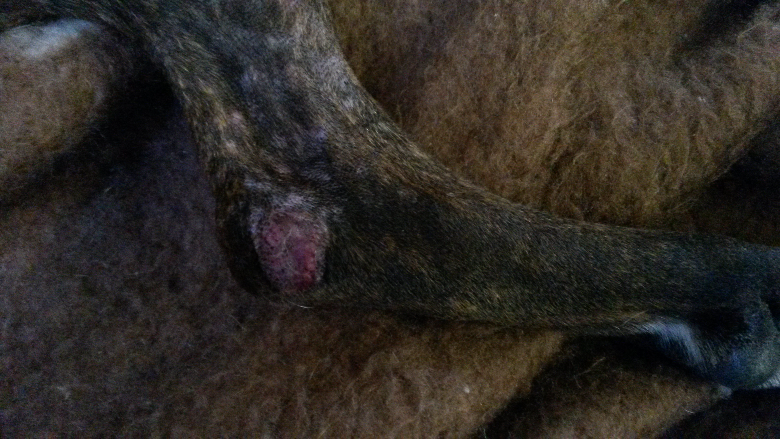 Máte zánět kůže v oblasti kloubu, doporučuji návštěvu vašeho veterinárního lékaře, z fotky se nedá určit příčina a zvolit účinná terapie.