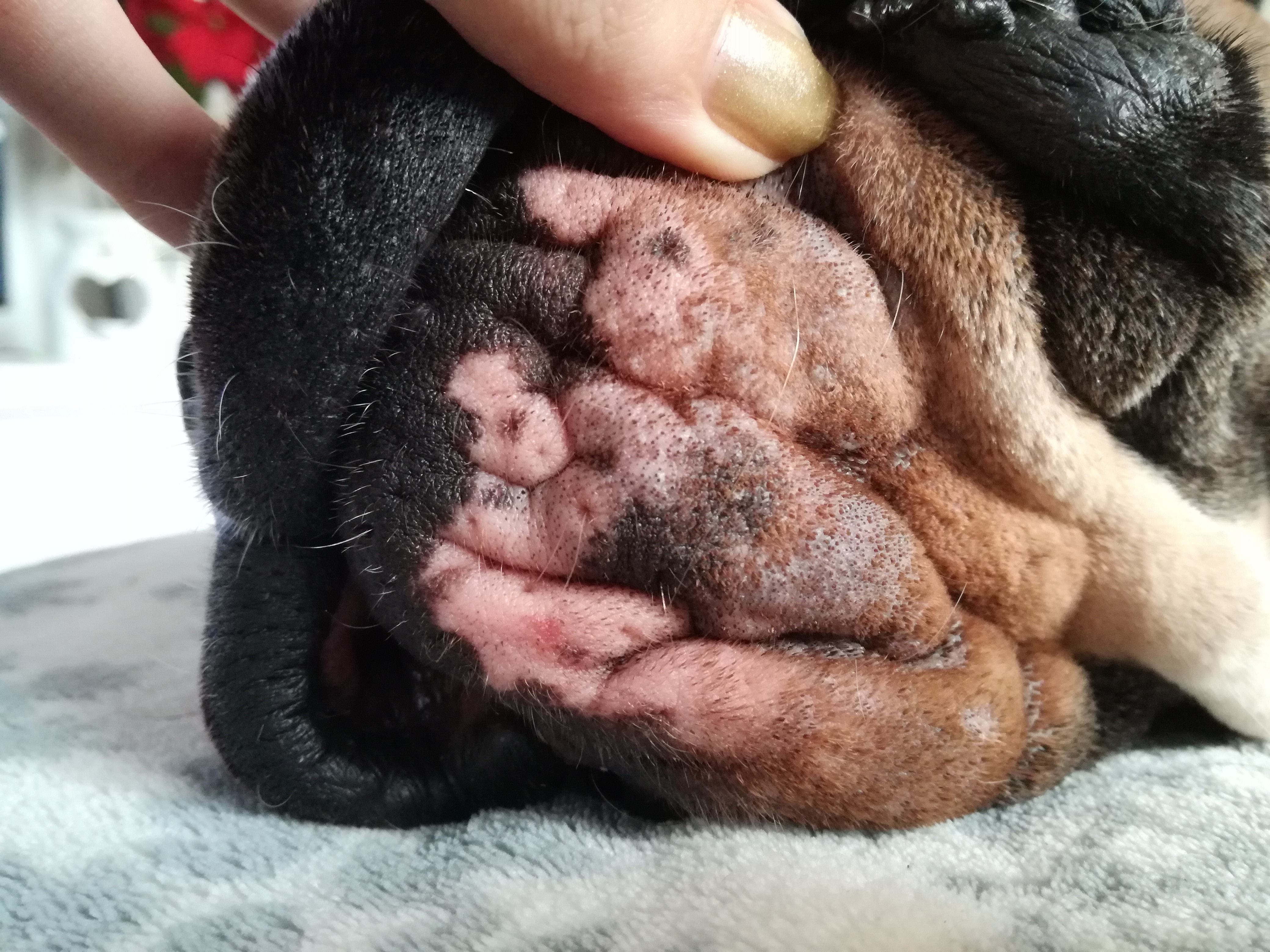 Dobrý den, máme pětiletého boxera co trpí alergií na pšenici. Granule jsme vyhodili a přešli jsme na barf stravu. Kůže se mu zlepšila, ale delší dobu nas trápí to, že má na bradě hrozně tvrdou kůži, chlupy mu tam skoro vůbec nerostou a když už tak jsou krátké a rezavé. Kůže je věčně nateklá a červená. Občas ho to svědí. Používala jsem různé přírodní mastičky nebo šampony ale nic nezabírá. Už si nevíme rady.