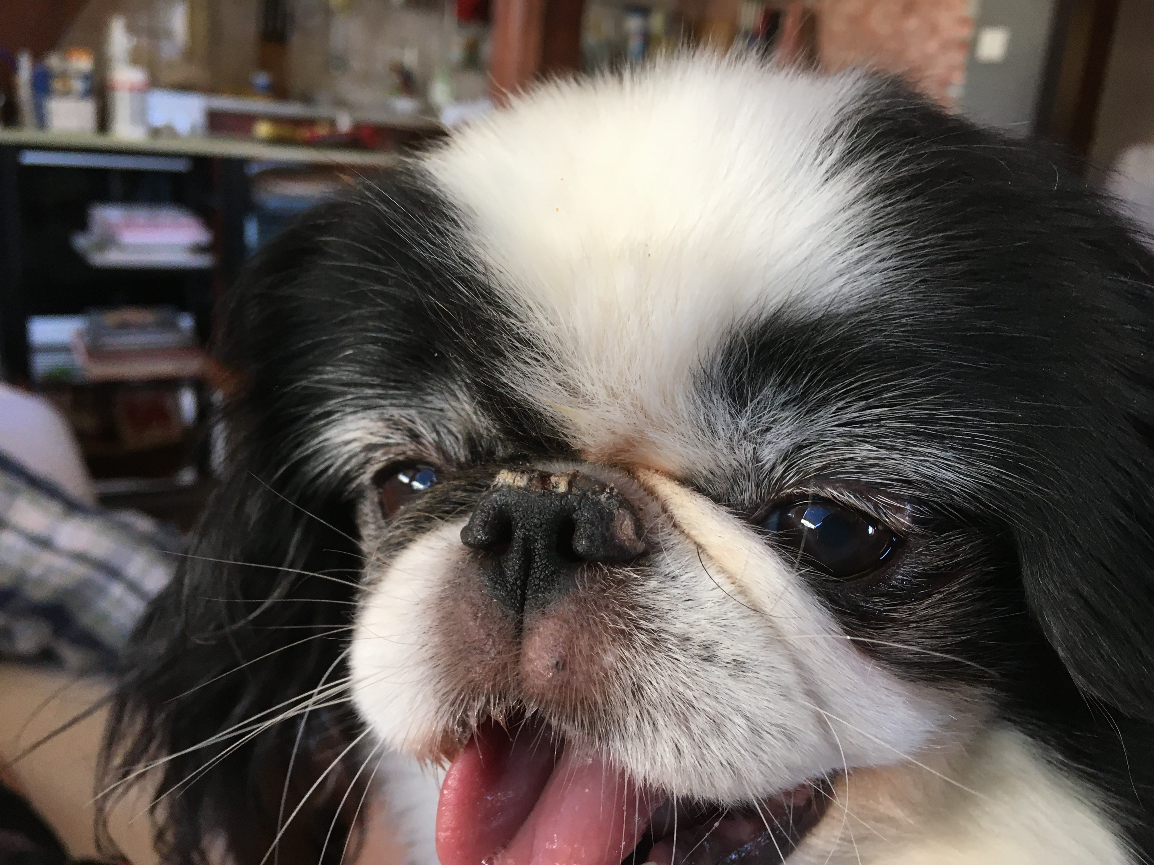 dobrý den, japan-chin má na čenichu strup, který se vždy odloupne,může být i krev, je to na horní hraně čenichu