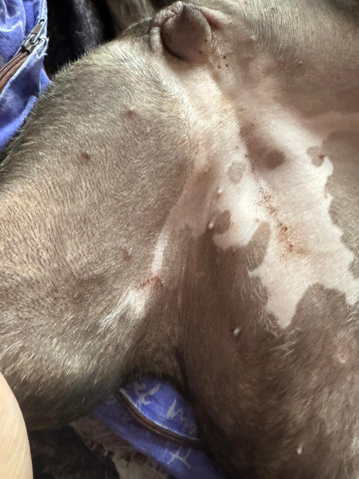 Dobrý den, může jít o zanícené Chlupové folikuly, pro přesnou diagnózu ale musíte navštívit veterináře. S pozdravem MVDr Orlovská