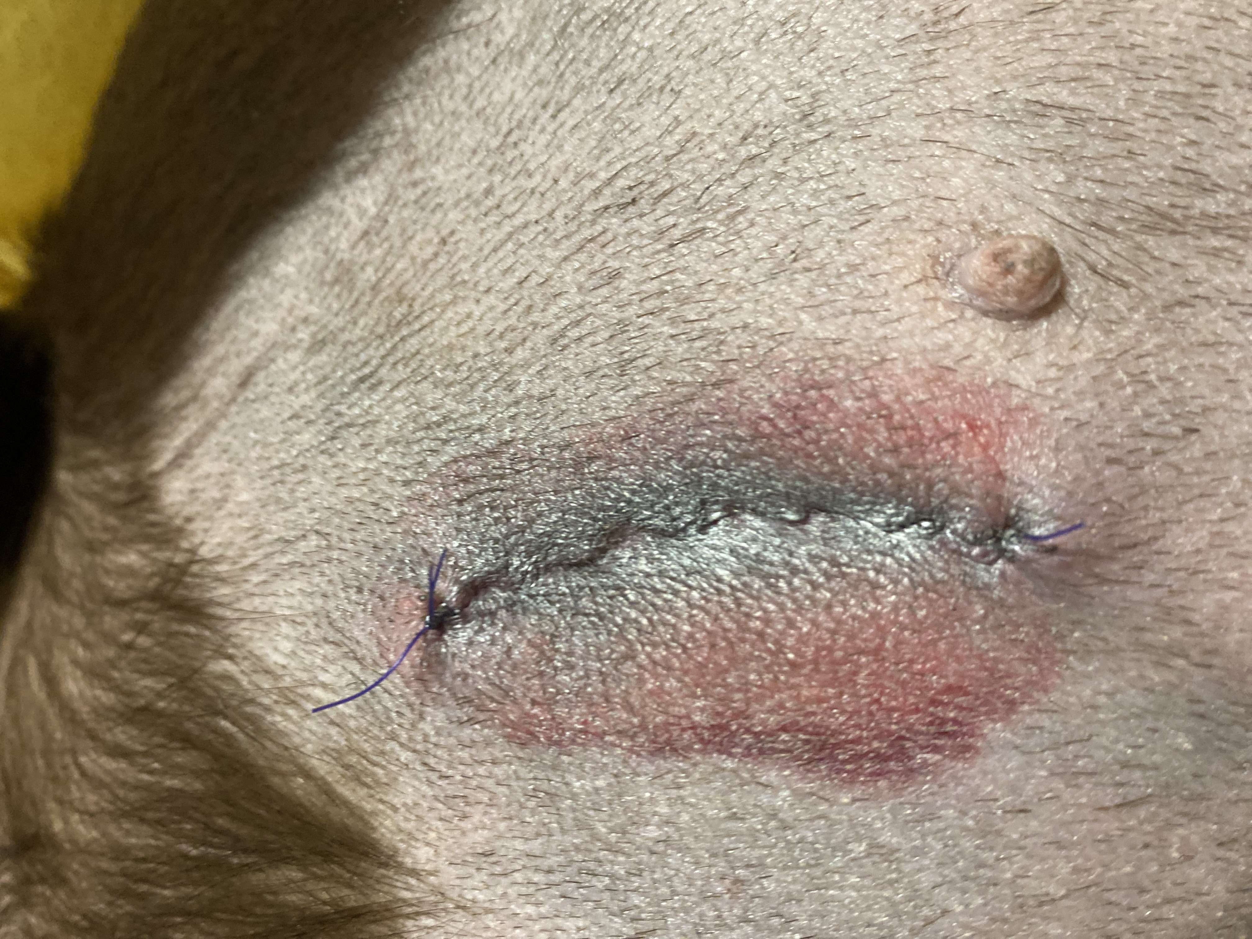 Dobrý den, rána samotná je krásná, kolem je hematom, což je po operaci normální. Nemažte to ničím, jen zamezte lízání a drbání.