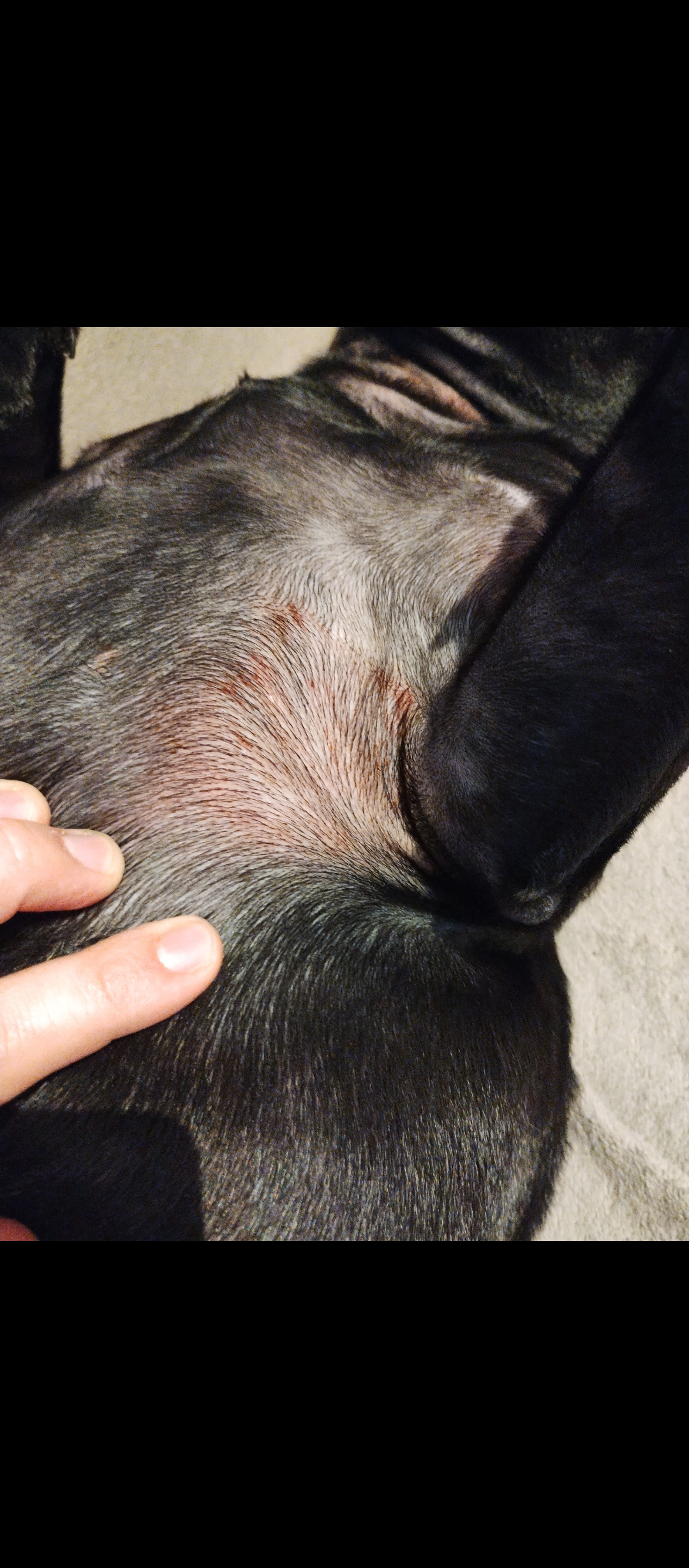 Dobrý den, naší fence (Stafordširský bulteriér) se na těle (podpaží, bříško)dělají červené fleky - viz. foto. Na packách si vykusuje kůži. Prosím o radu o co by se mohla jednat, případně jak léčit. Předem děkuji za odpověď.