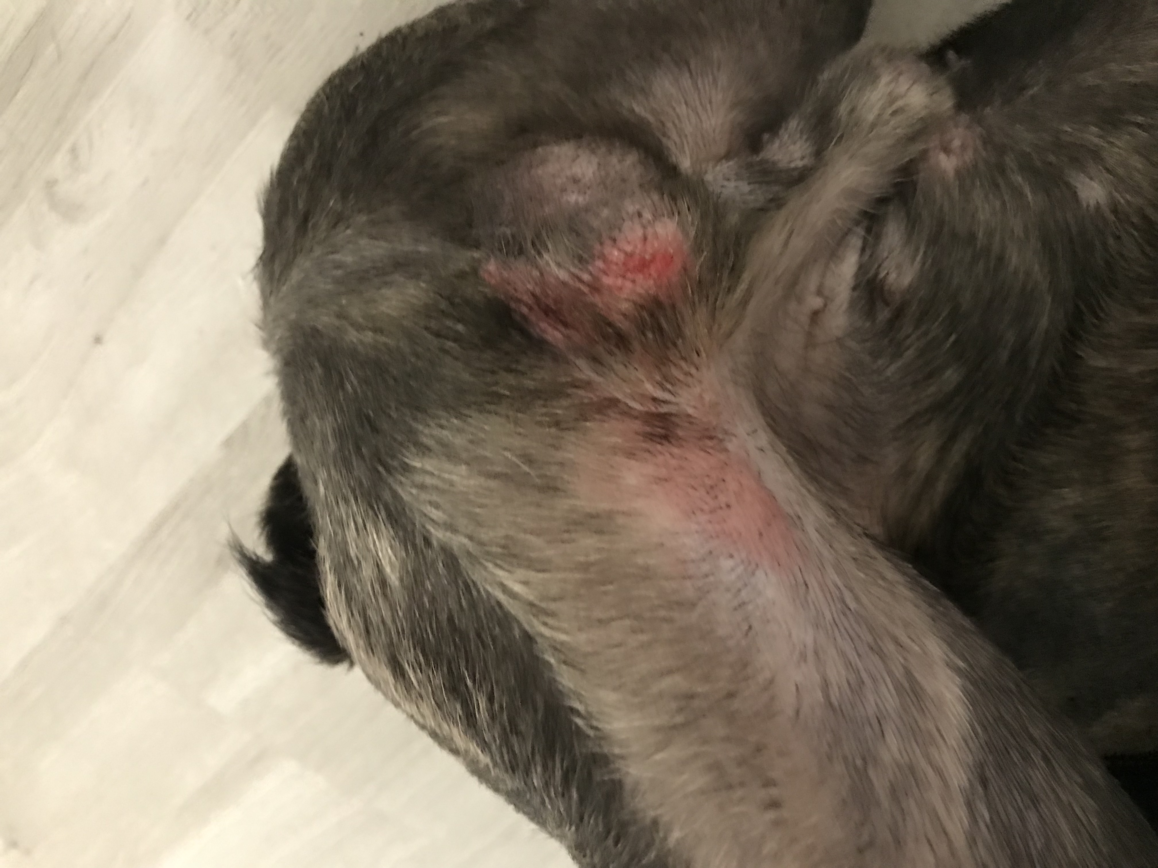 Dobrý den, pravděpodobně se jedná o akutní povrchový zánět kůže, který vznikl po nějakém podráždění. Zásadní je zabránit lízání, pes musí dostat například límec. Místo byste pak měli omývat například heřmánkem, sušit a případně namazat nějakou mastí s kortikoidy pro zklidnění. Při nelepšení během pár dní bude návštěva veterináře nezbytná.