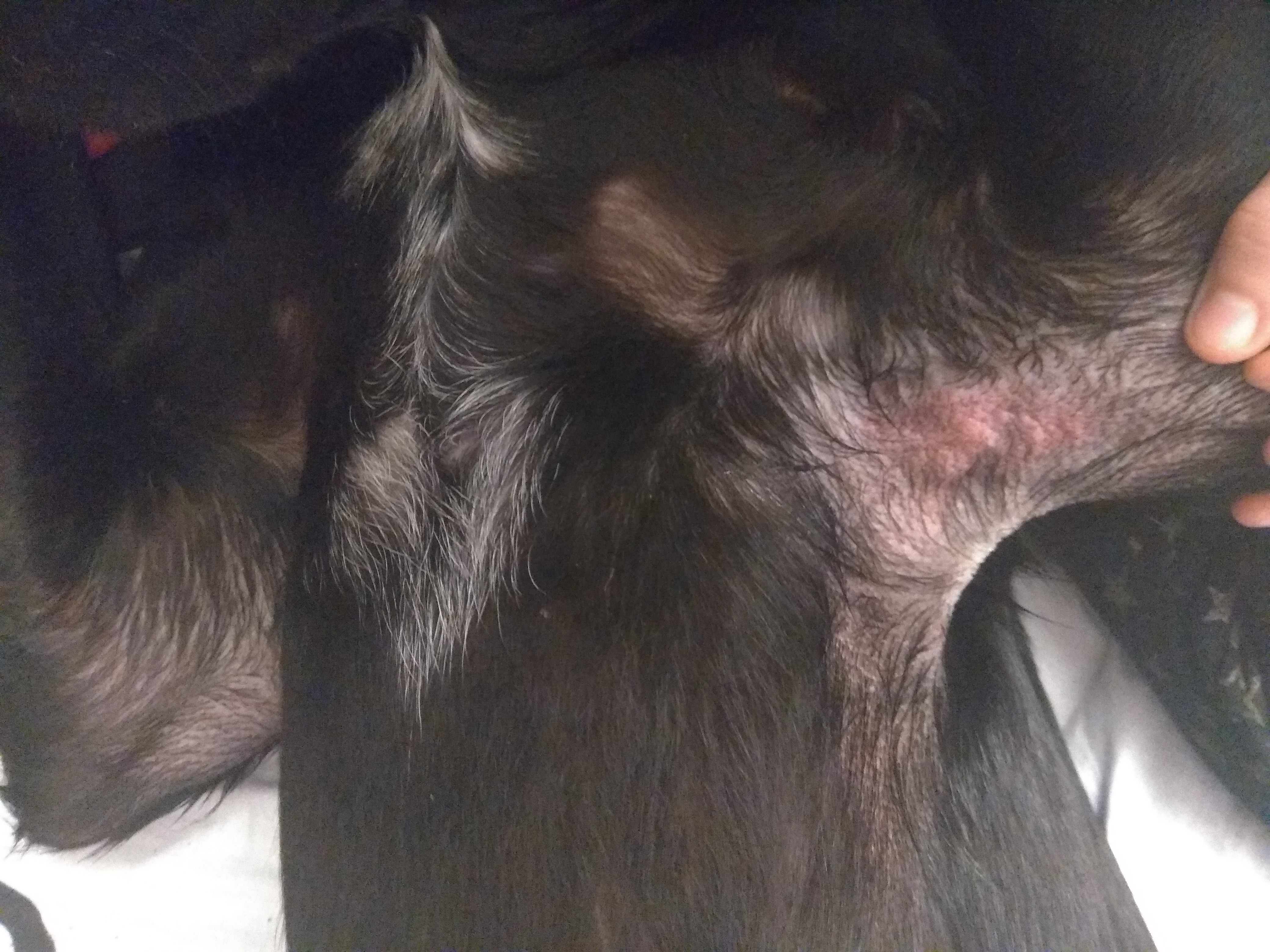 Dobrý den, můj pes Alex má v podpaží červený flek, který je lehce natekly. Myslela jsem si, že bude mít nějakou alergii na pamlsky, tak jsem mu dala týden bez pamlsků, a krmila jsme ho jenom granulemi od Hill's s jehněčim masem a rýží. Ale stále se to nelepší, jinak je lehce načervenalí na břiše. Flek si olizuje. Flek jsem mu namazala maštičkou.