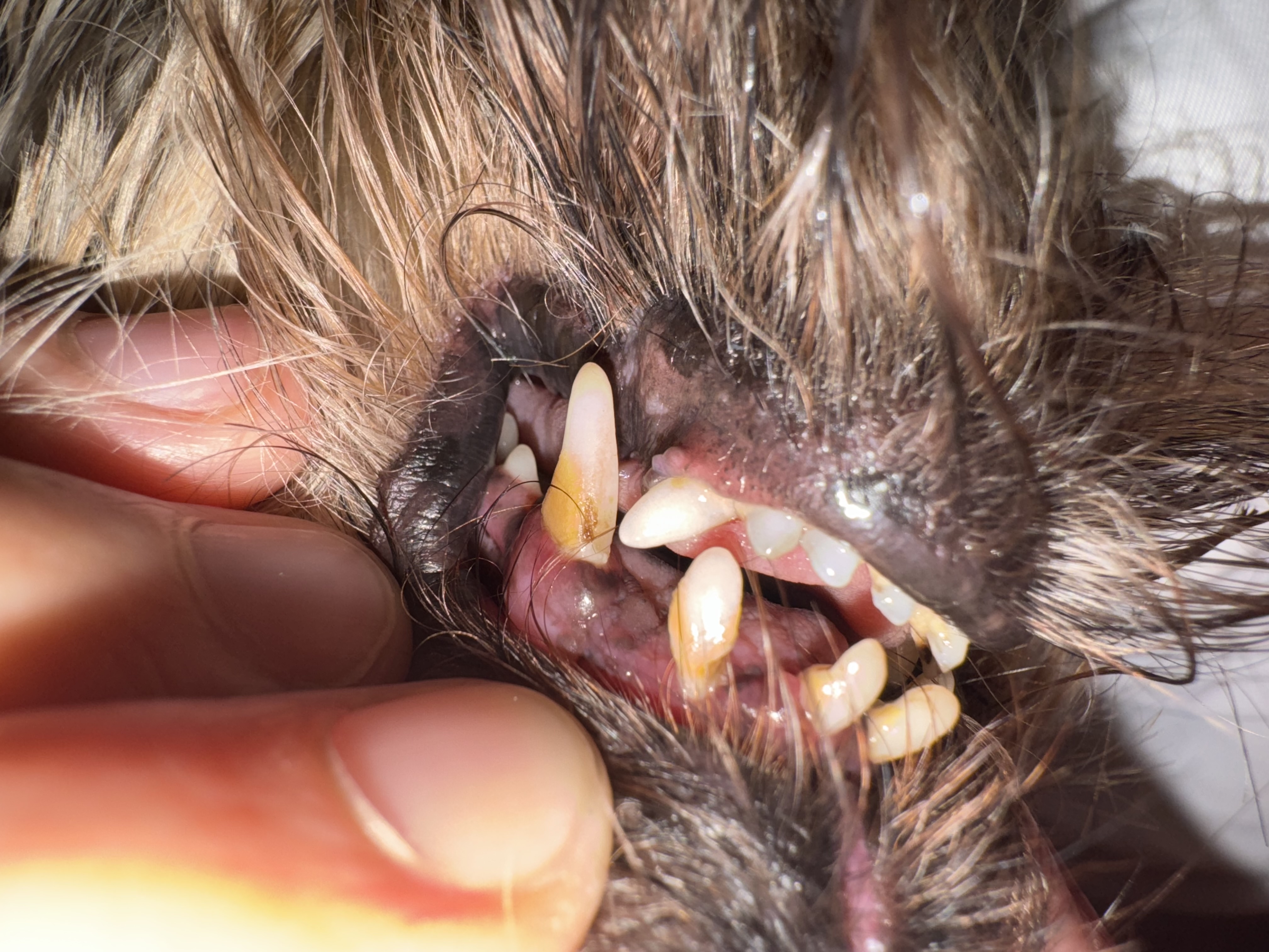 Dobrý den, mám fenečku jormisrskeho teriéra. Je jí 6 let. Celý život čistíme zoubky, a vždy je měla krásné. Na čištění býka snad 2 X za život víc nebylo třeba. Nicméně, kvůli rodinným okolnostem jsem bohužel poslední rok nezvládala zoubky čistit a teď jsem si všimla, že se jí přední hrozně kývají, má je úplně volné a dost jich už dokonce i chybí. Všimla jsem si dnes, že měla i trošku pěnu u pusinky, když se jí jeden zoubek protočil a bojovala s tím - nakonec vypadl, jak byl volný. Nechci aby se trápila - čistím enzymatickou pastou a začala jsem také poctivě dokonalou láskou. Co prosím doporučujete? Jsem v zahranici, takže k veterine nemůžu. Jen pokud neznáte ze je to nutné. Moc děkuji za rady! Nechci aby se trápila. Maso papá, kokinko si taky vezme. Úplně ve předu má tak poslední 3 zoubky - dva se kývou více, jeden méně. Špičáky jsou pevné. A pevný mi přijde i spodní patro.