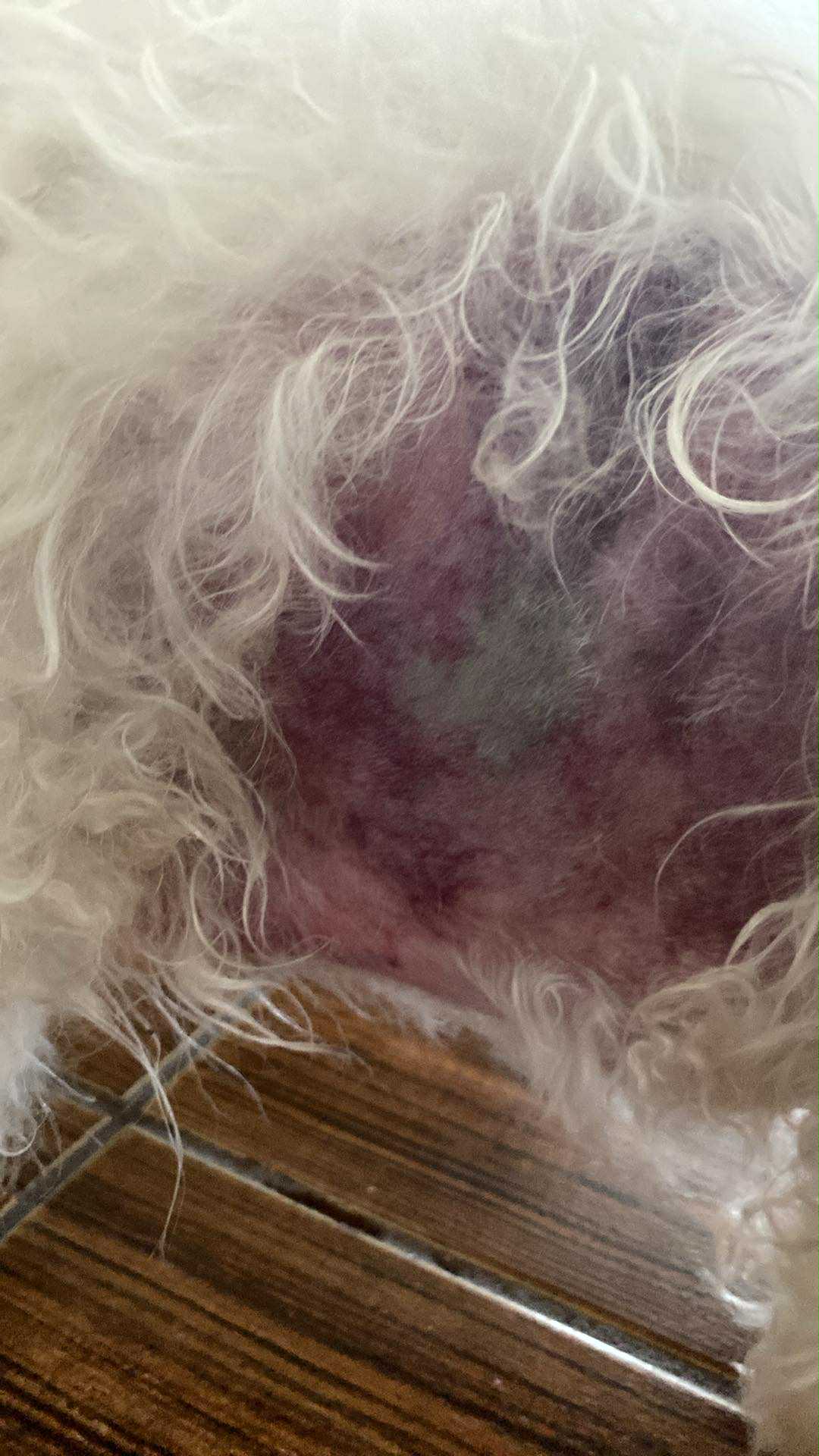 Dobrý den, posílám foto flíčku 2 dny po anestezii. Ve středu byla na čištění (a trhání) zubů, při předávání doktorka říkala že tam má menší flek, který doufá, že do 2 dnů zmizí. Dnes jsme byli na kontrole a stav je viz foto :-/ Nevypadá, že by ji to bolelo, ale na té straně má v tříslech svěšenou kůži, dle lékaře dnes je to otok, který gravitací jakoby spadl dolů. Co mě znepokojuje je barva flíčku. Nikdo mi nedokáže říct, jestli to vzniklo spálením od vyhřívací podložky nebo naopak nedokrvením (což říkala ve středu lékařka co zákrok dělala). Dnes jsme k lékům na bolest dostaly antibiotika, šampon s chlorhexidinem a mast Alaptid. V pondělí další kontrola. Mohu se zeptat na druhý názor ohledně toho čím to mohlo vzniknout, správnosti léčby a prognozy vývoje? Pejsek je maličko "přešlý", jde vidět, že to není úplně ono.
