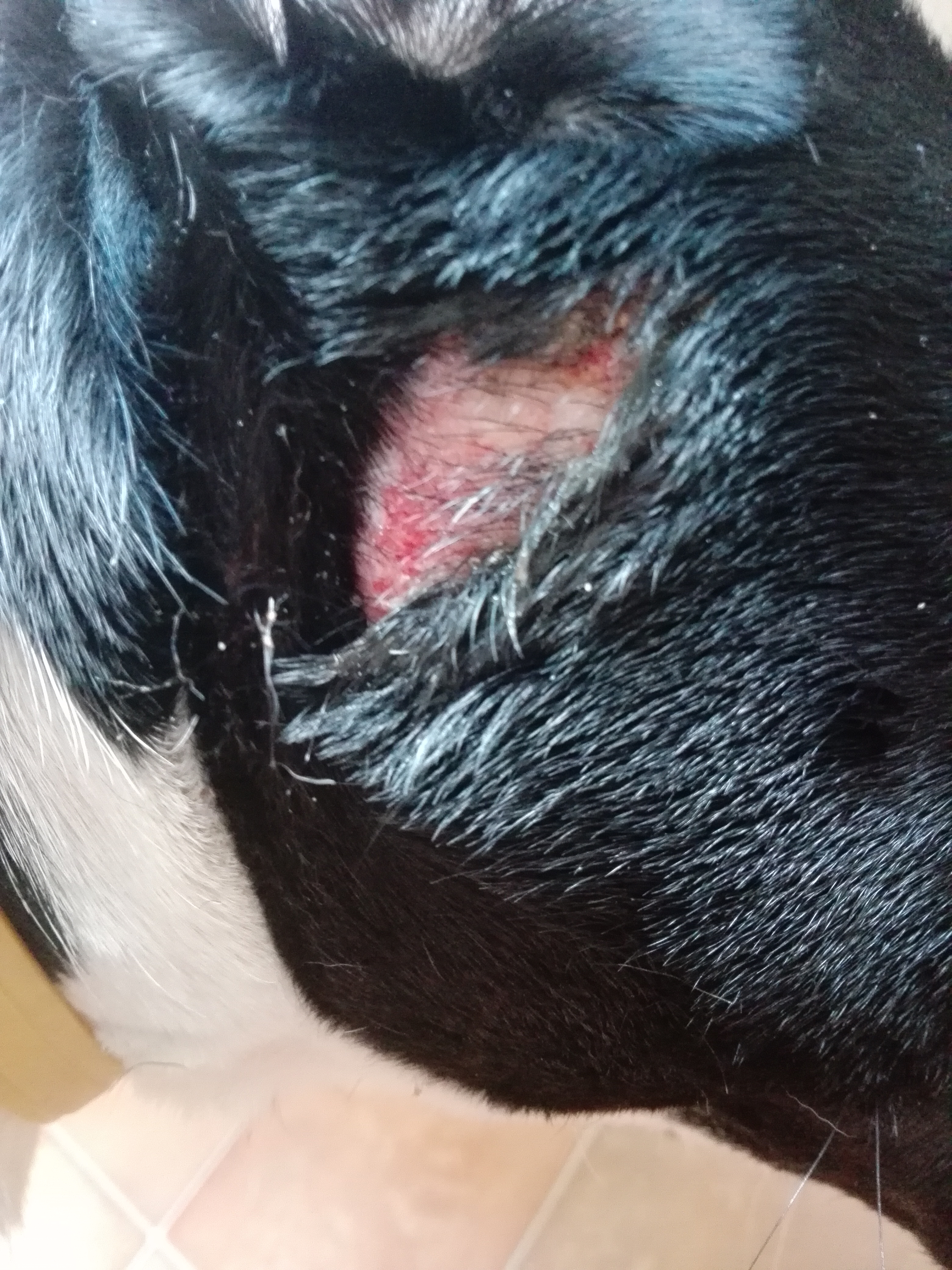 Dobrý den. Včera jsem si všimla u feny flicku na straně pod uchem, vypadalo to jako na první fotce, potrela jsem betadinou. Dnes měla zalepene chlupy i okolo te "dírky", tak jsem ji to lehce otrela mokrou zinkou a chlupy vypadaly, viz druhé foto. Je mne blbé se ptát takhle po internetu, ale teď mi nic jiného nezbyva. ☹️ Co prosím myslíte, ze by to mohlo být? Předem děkuji za odpověď.