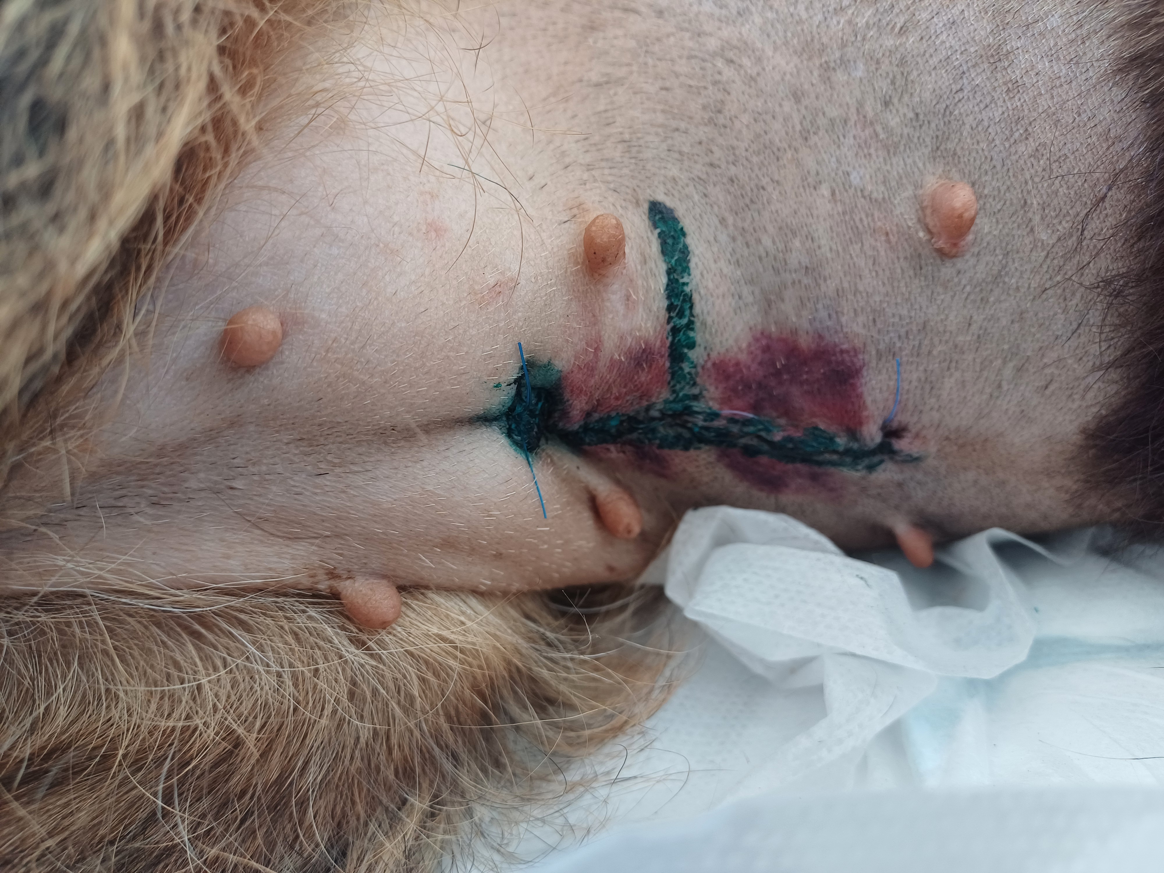 Dobrý den, hematom je běžnou reakcí, rána samozřejmě při operaci krvácí, tak se krev vylije i do podkoží. Dle fotografie bych stav neviděla jako nijak komplikovaný, ale berte v potaz, že to samozřejmě bez vyšetření psa plně zhodnotit nelze.