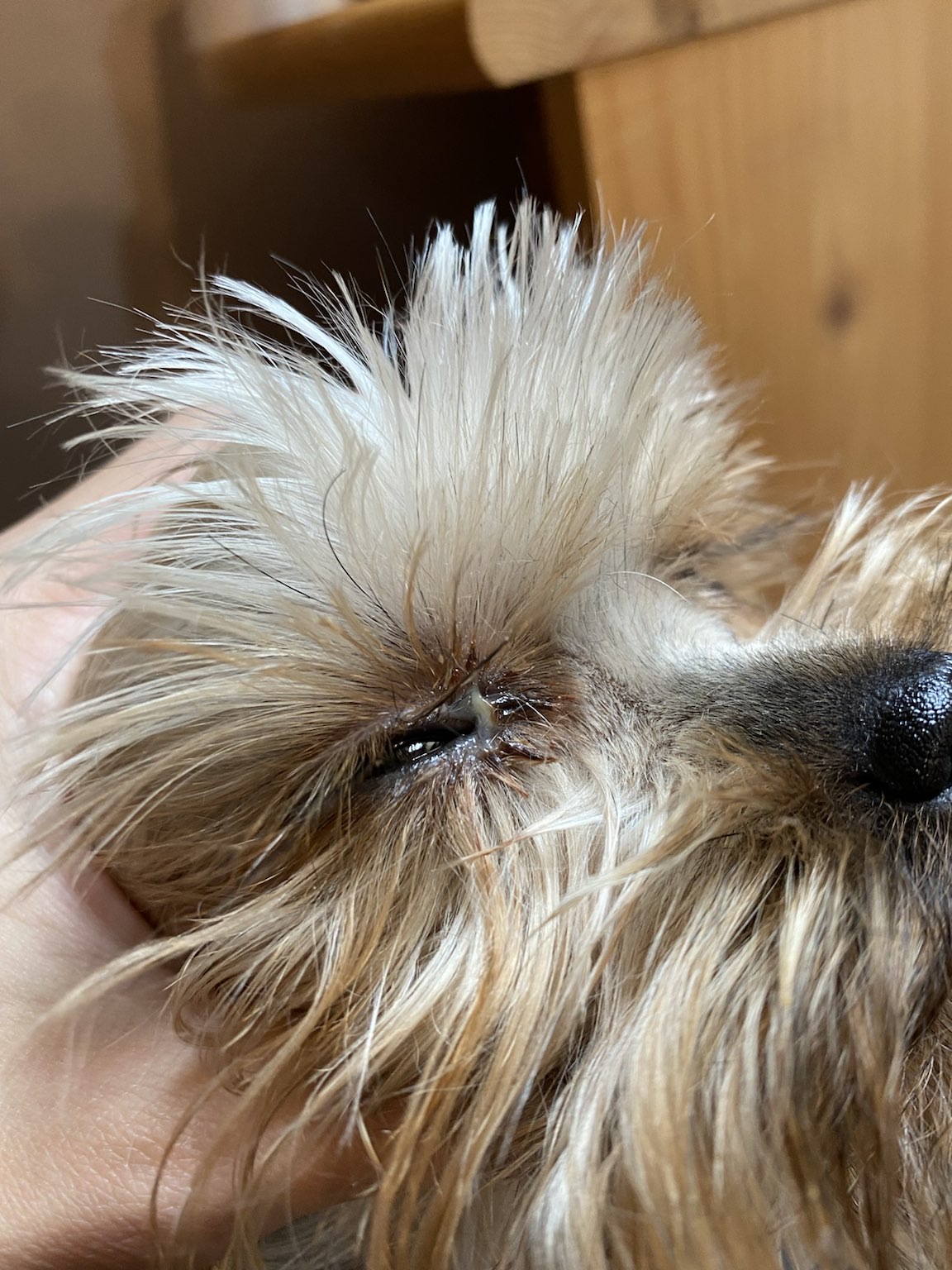 Mela bych na Vas otazku ohledně stavu oka naseho jorksira ( 2 roky ). Zacalo to silnejším vytokem z oka a nahromadenim ospalek. Par dni pote mela nase fenka hutnejsi vytok z oka, stridala se hneda a nazloutla barva. Ode dneska je ale vytok hustejsi, slepil ji i rasy. . Ocni okoli cistime kazdy den (minimalne jednou) a občas i proplachujeme s nacl. Musim rict, ze nase fenecka byla na oci vzdy nachylnejsi, uz jsme v minulosti problemy se zanetem, hnisem, etc řešili. Dokázala byste takto na dálku doporučit nejake kapky které by dokazaly pomoci Pro lepsi predstavu zasilam foto, ktere jsem dnes poridila. Dekuji a preji krasny vecer. Denisa + Bibi