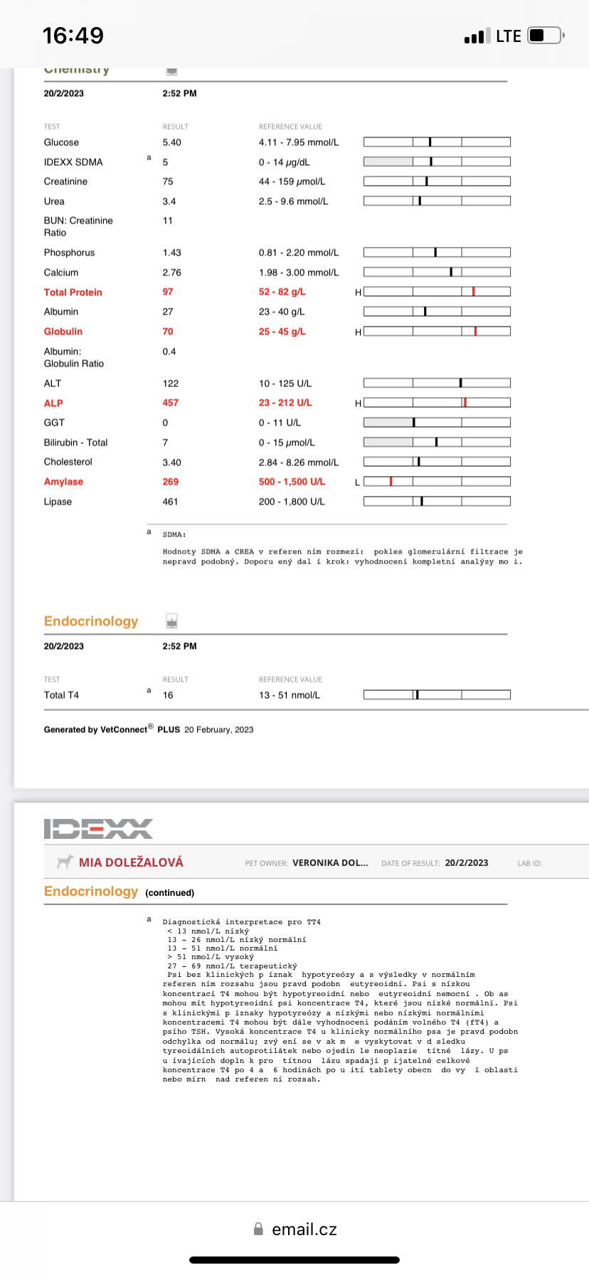 Dobrý den, chtěla bych se zeptat, od půlky ledna nám přišla naše skoro 7 létá vykastrovaná fenka (sibiřský husky)smutnější a taková línější a pak měla i řídkou stolici pokaždé když se normálně vykadila s tím, že kadila převážně 1 denně. Zašli jsme na veterinu a tam se ji zjistila i 40,5 teplota tak se nasadily antibiotika injekční který dostávala 3 dny ob den, nasadila se ji dieta , teplota po 3 dnech ustoupila a teď od soboty se nám zdá konečně lepší a lepší s tím že dnes se ji udělali krevní odběry ( výsledky viz příloha) a ještě jsme sbírali 3 dny trus který se poslal do laboratoře, že veterinář chce vyloučit aby se nejednalo o exokrinní pankreatickou insuficienci. Furt doufáme a věříme, že si prošla nějakou infekcí nebo bakterii chytla a ze to bude dobrý.Chtěla bych se zeptat co si o tom myslíte. Předem moc děkuji za odpověď s pozdravem Eimannová