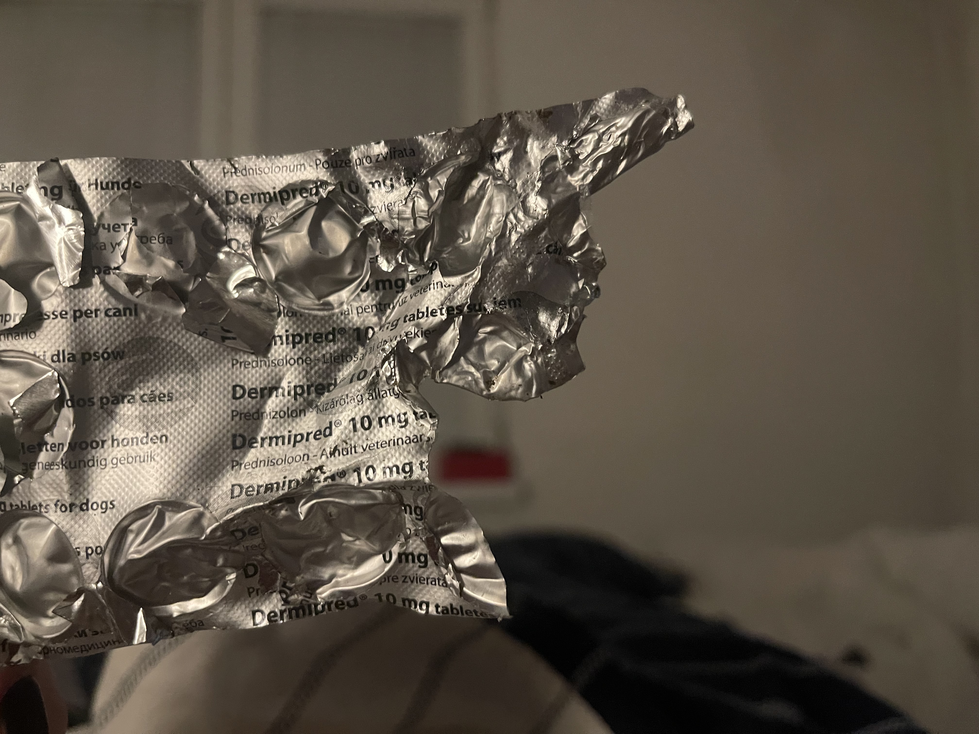 Dobrý den, můj pes v noci ukradl léky (jeho, tedy psí kortikoidy). Měl zde poslední tři kusy (Dermipred 10mg). Nevím ani, jestli se to stalo v noci nebo někdy přes den, protože ohryzané plato ,,poslušně” vrátil zpět na místo. Prosím, hrozí mu nějaké nebezpečí? Především z kousku toho plata, které snědl? Přikládám foto, aby jste viděli, kolik toho plata snědl. Děkuji Vám moc.