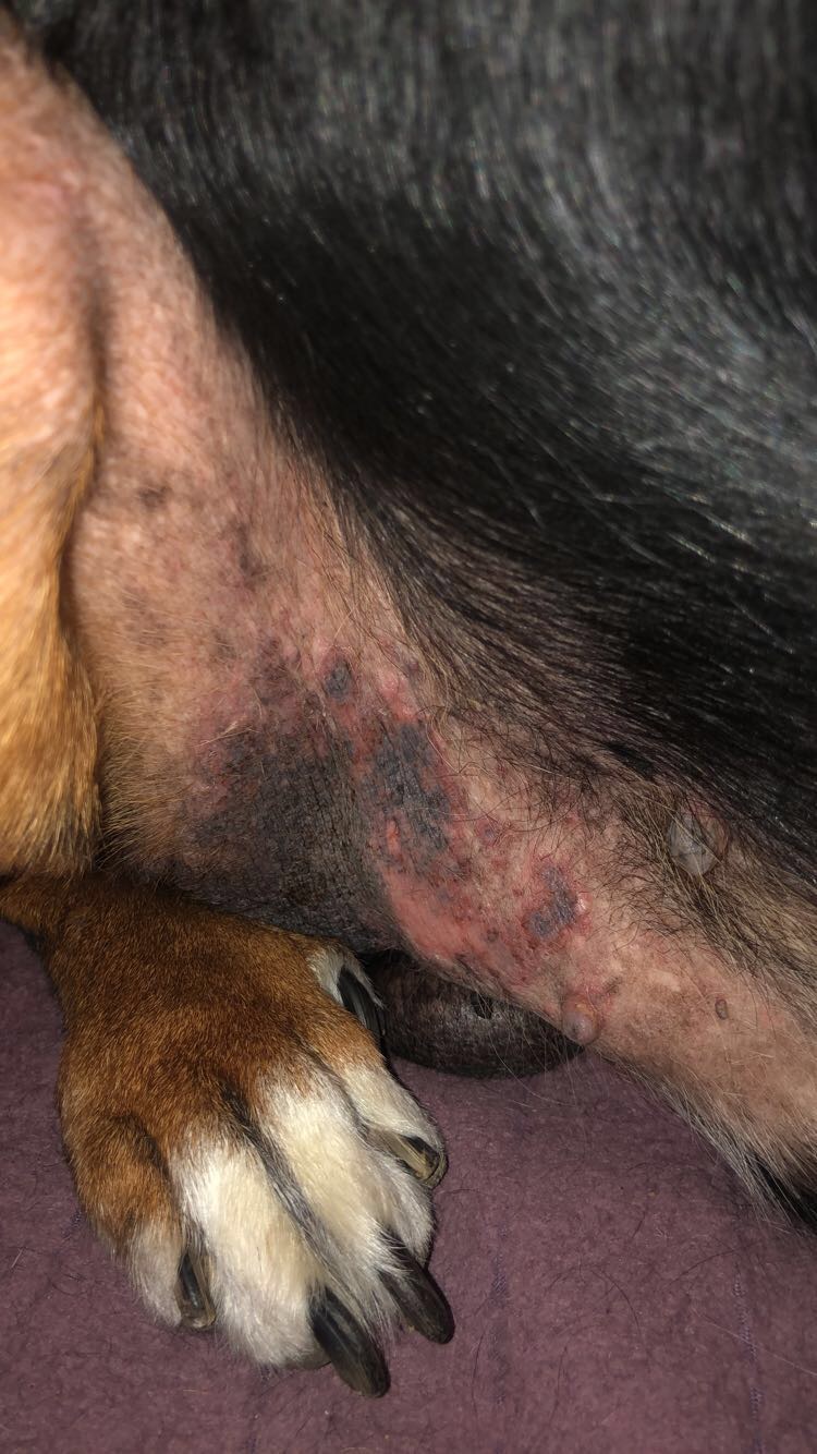 Podle fotografie je v místě hyperpigmentace, tzn., že problém trvá již delší dobu a kůže reaguje obranným zvýšeným ukládáním pigmentu. Diagnostika kožního onemocnění bohužel není možná na základě obrázku, bude to muset vidět veterinář, ideálně dermatolog. Je potřeba vyšetřit celého pejska. Příčin totiž může být celá řada.