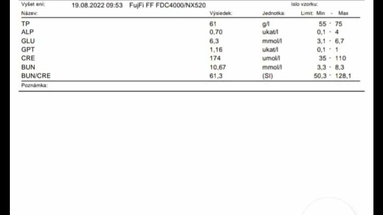 Dobrý den. Laboratorní výsledky jsou nedostatečné. Biochémie je jen z části a chybí zcela hematologie. Je zde zvýšena hladina močoviny a kreatininu., tz. rané selhání ledvin. S pozdravem MVDr Jančík.