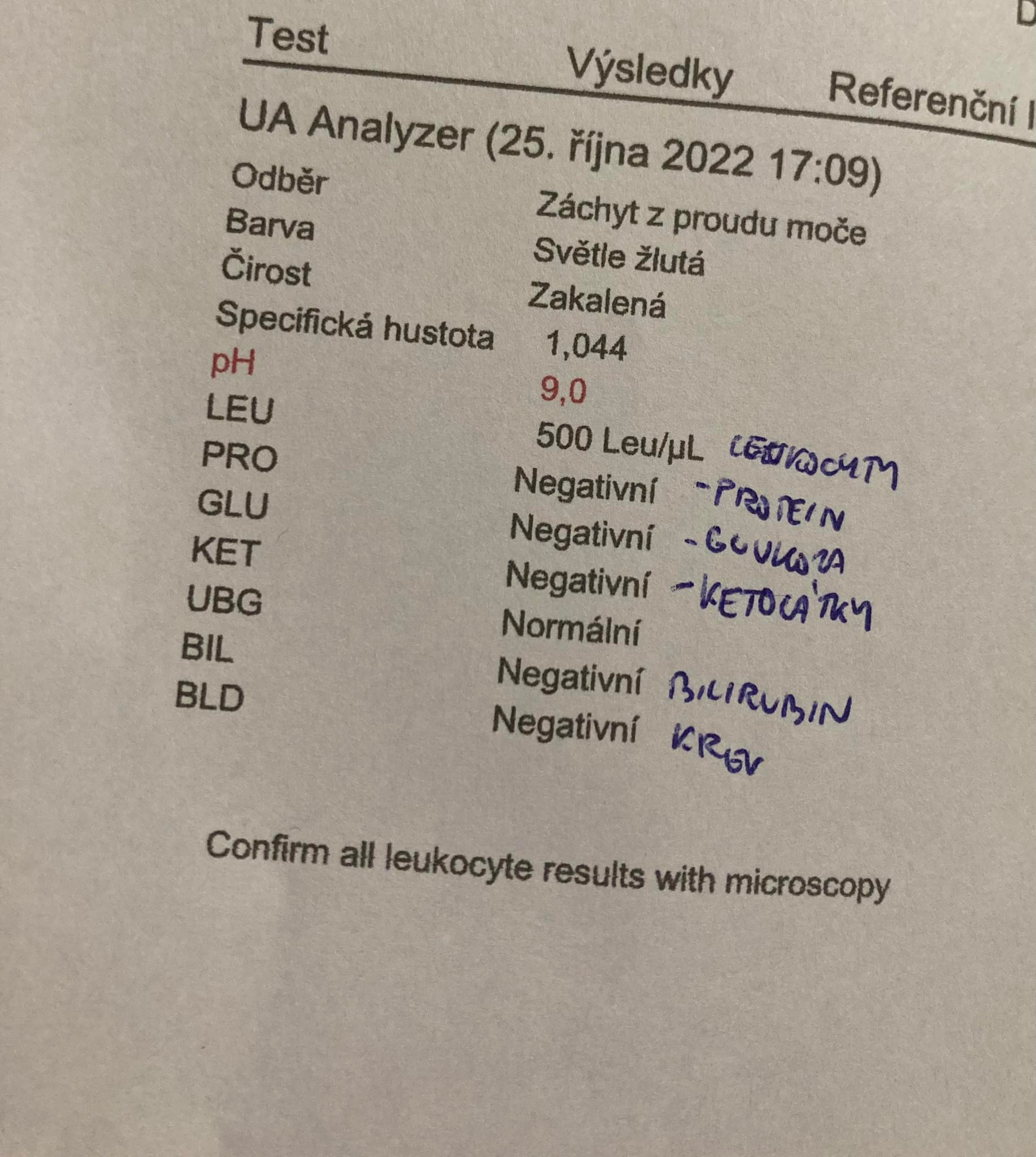 Dobrý den, u 5 letého labradora, byla zjištěna bakterie v moči E-Coli, 17.10 byla nasazena Antibiotika + dány léky na bolest Previcox, jelikož měl stále obtížné močení ( dále užívá forthyron a kálium bromáte). Dělalo se sono močového měchýře, prostaty i ledvin. Antibiotika máme na 14 dnů. Včera jsme dělali kontrolní test moči s výsledkem ( viz.příloha). Pan doktor nás upozornil na zvýšené PH ( což prý také může být krmivem- je na Royal Canin Hypoallergenic . Občas dostane nějaký ten piškot, + dávám pivovarské kvasnice - ty máme momentálně vyřadit) a za týden přijít na další test. Chci se zeptat na ostatní hodnoty, zda jsou v pořádku? Vidím také, že tam je zakalená moč( jaká může být příčina?) Mohly by být tyto výsledky příznakem nějaké vážnější nemoci? Mám zkrátka strach, jestli má v pořádku ledviny. Děkuji