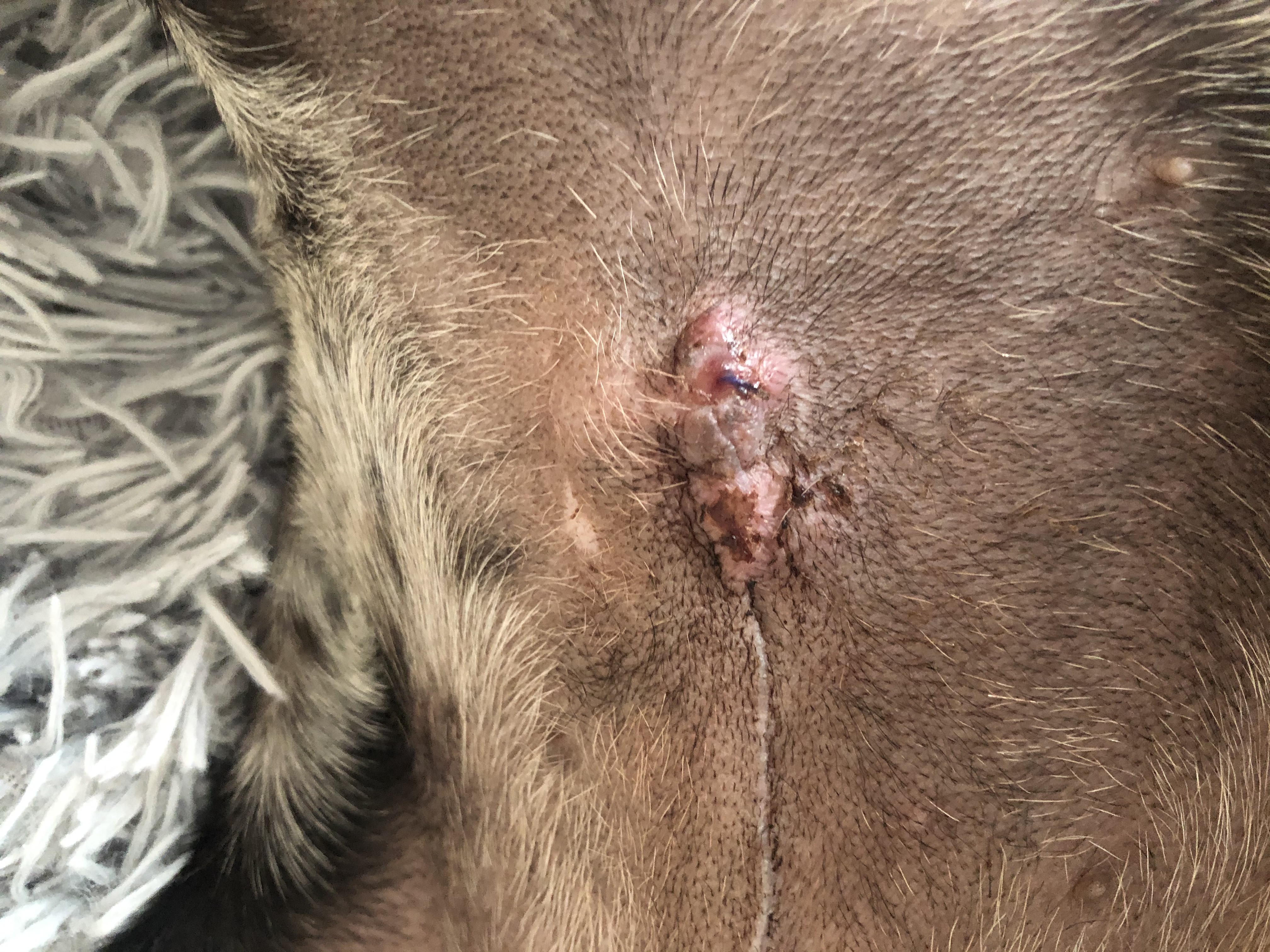Dobrý den, v jizvě má nejspíš zánět může to být reakce na šicí materiál. Každopádně si to nesmí olizovat, protože tím tam zanáší infekci a mechanicky to dráždí. Musíte zabránit lízání krytím rány nebo límcem a ránu čistit. Doporučuji raději navštívit veterináře.