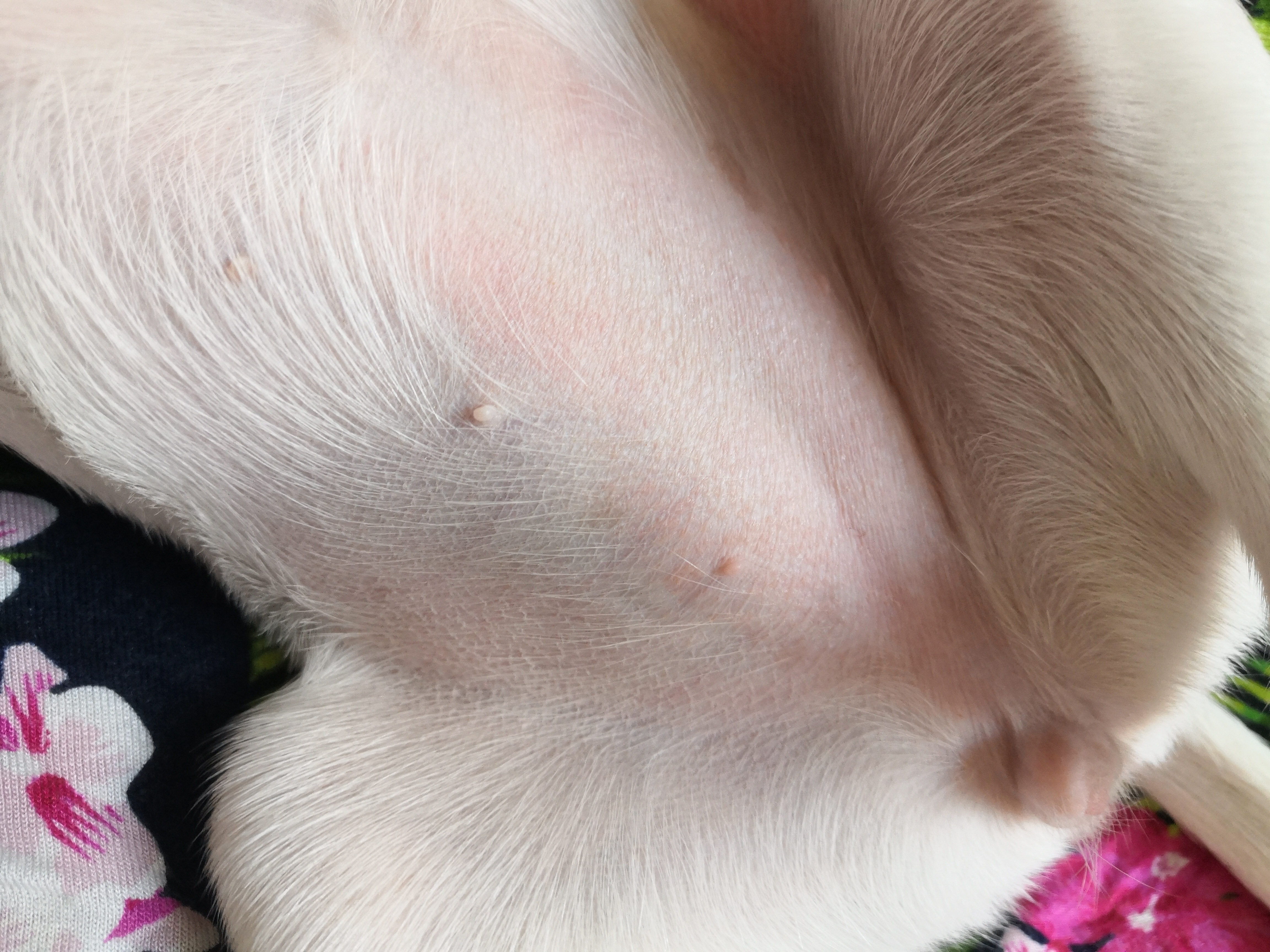 Dobry den, našemu 5 měsíčnímu šťěňátku kříženci jsem našla fleky na bříšku barva taková do šediva a furt se mi drbe a kouše jako kdyby mela blechy ale blechu jsem nenašla. Co to může být?