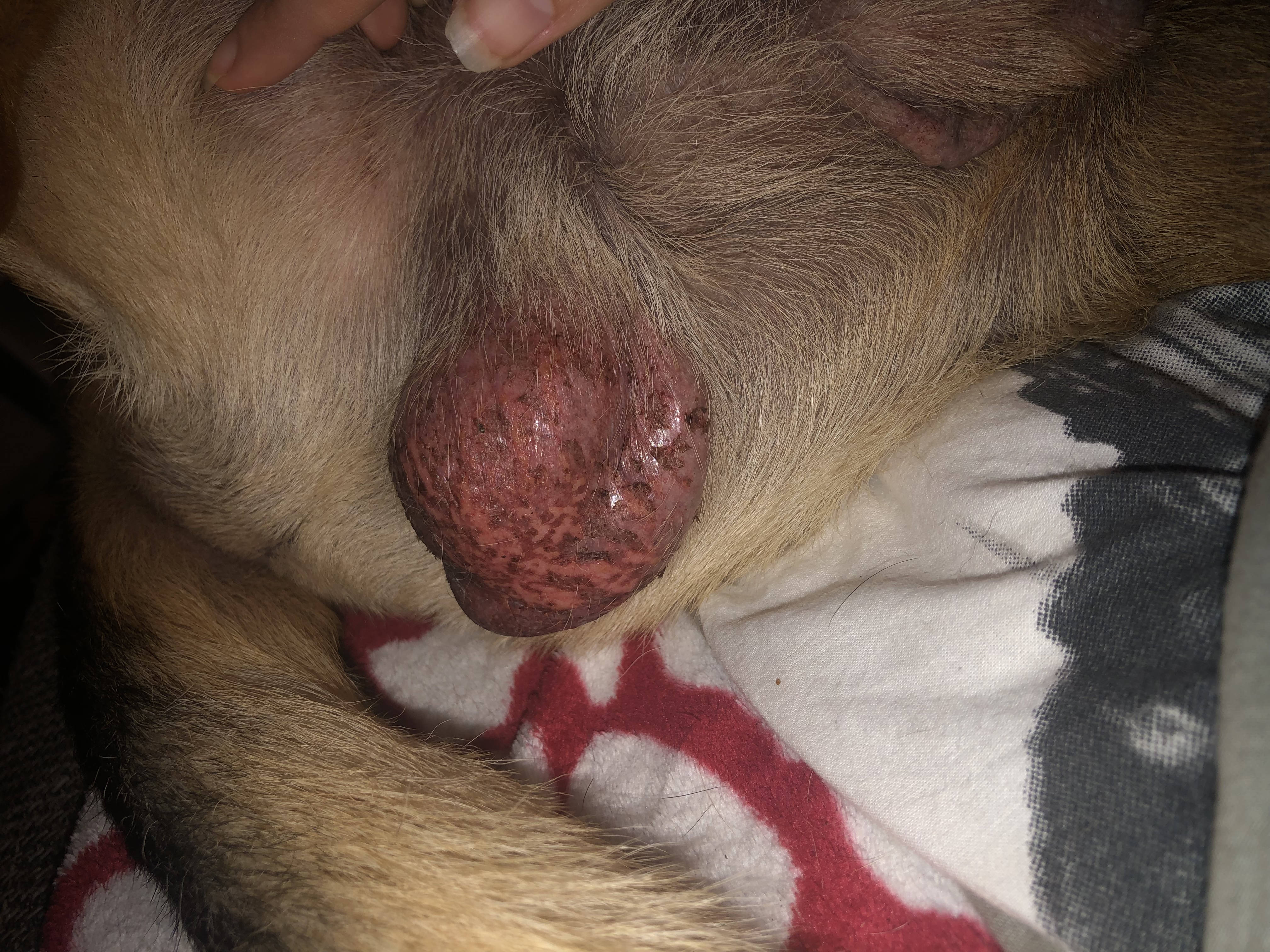 Dobrý den, tak to je už opravdu hodně a musí to bolet. Zabránit lízání, dezinfikovat - ideálně clorexy šampon, skinmed gen 2% apod a mastička - k běžně dostání actimaris, vetramil, alaptid, dermacius, ialugen apod.... Víc pak musí až veterinář. V den kontroly u veta to ničím nedezinfikujte ani nemažte. Čím dřív navštívíte veterináře, tím líp.