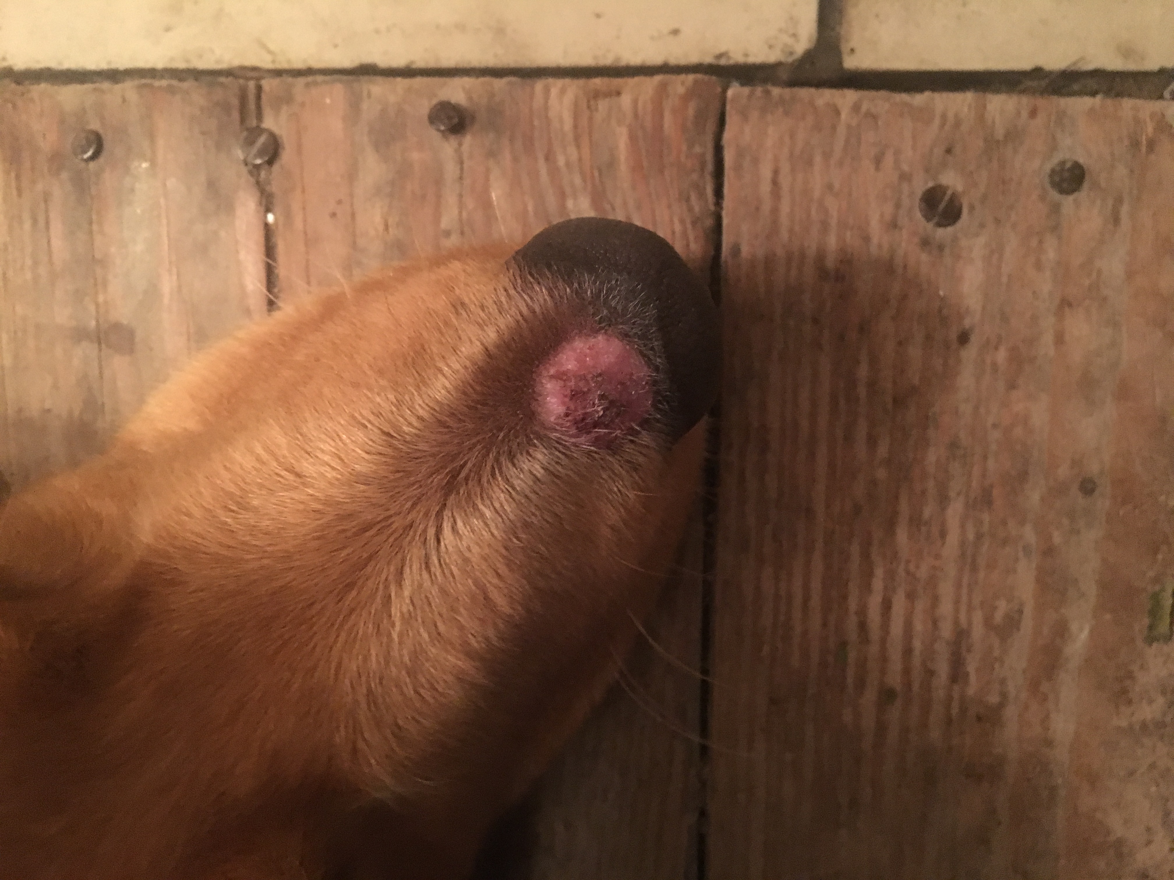 Dobrý den, pejskovi se na nose objevil "flek" - viz foto. Žije s babičkou, takže netuším kdy přesně se mu to objevilo, nicméně neškrábe si to, ani na dotek ho to evidentně nebolí. Je to venkovní pes, takže mě napadá, že si mohl odřít čumák, když ho strkal kam neměl, jen na odřeninu mi to přijde hodně pravidelné. Nevíte někdo co by to mohlo být, případně zda to máme nějak řešit nebo se to zhojí? Děkuji za reakci. K.