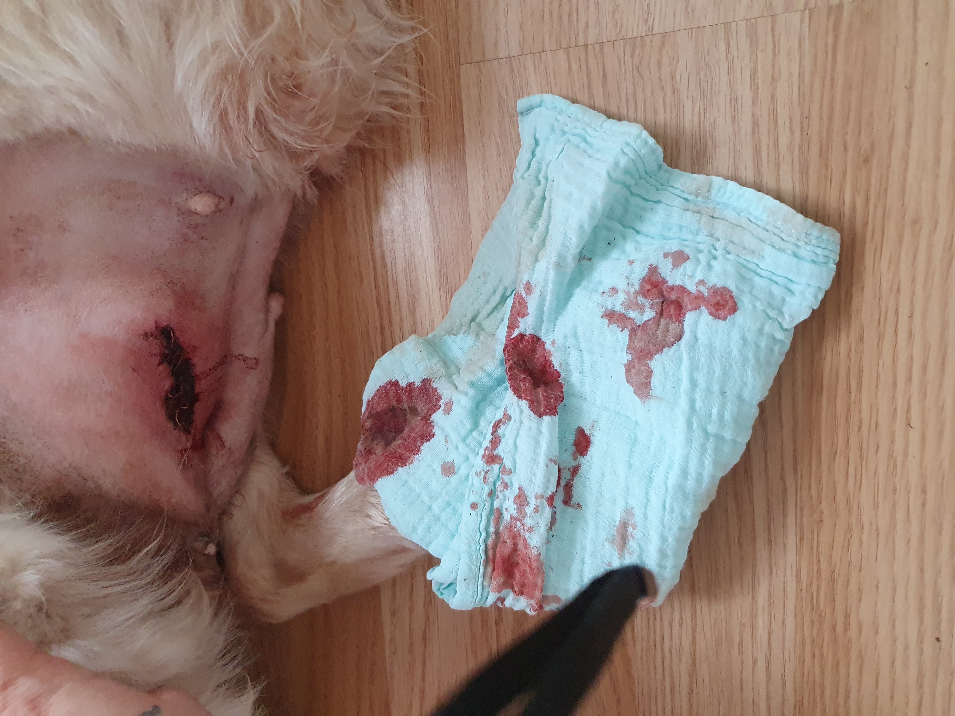 Rana byla zalepena po operaci jenze ji vznikl otok hned na druhy den a zvetsovalo se to a ona nedostala z veteriny tu ochranu na hlavu jen tricko tim padem si to sundala a olizala jenze ja si myslim ze tu infekci dostala hned protoze jeste nez to olizala tak ten otik byl ve velikosti morcete ,takze jsem to omyla cistou vodou a hned zalepila .