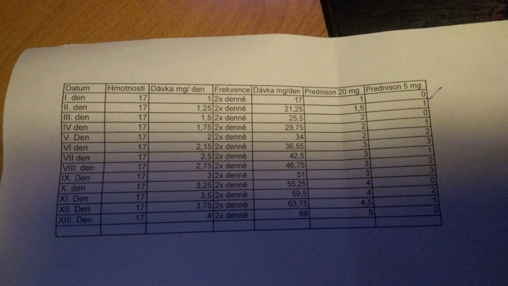 Dobrý den, moc té tabulce nerozumím. Dávka Prednisonu se obvykle začíná např. na 1 mg/kg 1-2x denně, nechá se třeba 5 dní a pak se postupně vysazuje. Záleží na indikaci. Ve Vašem případě se nejspíše jedná o othematom, který by bylo možné řešit i bez celkově podaných kortikosteroidů (to je ten Prednison) - napíchnout tu "bouli" na uchu, vysát tekutinu a dovnitř aplikovat kortikosteroid lokálně. V některých případech je ale nutné přistoupit k chirurgickému řešení, kdy se ucho v celkové anestezii prošije a na odvod tekutiny se použije drén nebo knoflík. Taky je důležité zaměřit se na vyvolávající příčinu, což může být například zánět v uších.
