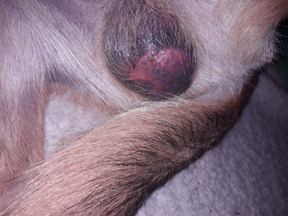 Dobrý den, moc prosím o radu. Pes si včera celý den abnormálně lízal šourek. Trochu se mu na něm loupala kůže, ale u něj nejde o nic nezvyklého. Dnes se lízání ještě zhoršilo, pes je očividně nesvůj, chodí se staženým ocasem..něco mu je. Ale normálně žere, ven se těší apod. Koukla jsem mu na šourek a najednou na něm má růžový lehoučce vystouplý flek (celkem velký). viz foto Koukala jsem že v poradně tu bylo něco podobného označeno jako colpitida za předpokladu zčervenání a výtoku z penisu, ale nic takového jsem nepozorovala. Nevíte prosím, o co by mohlo jít, případně zda by pomohlo něco z domácí lékárny? Děkuji moc Anna