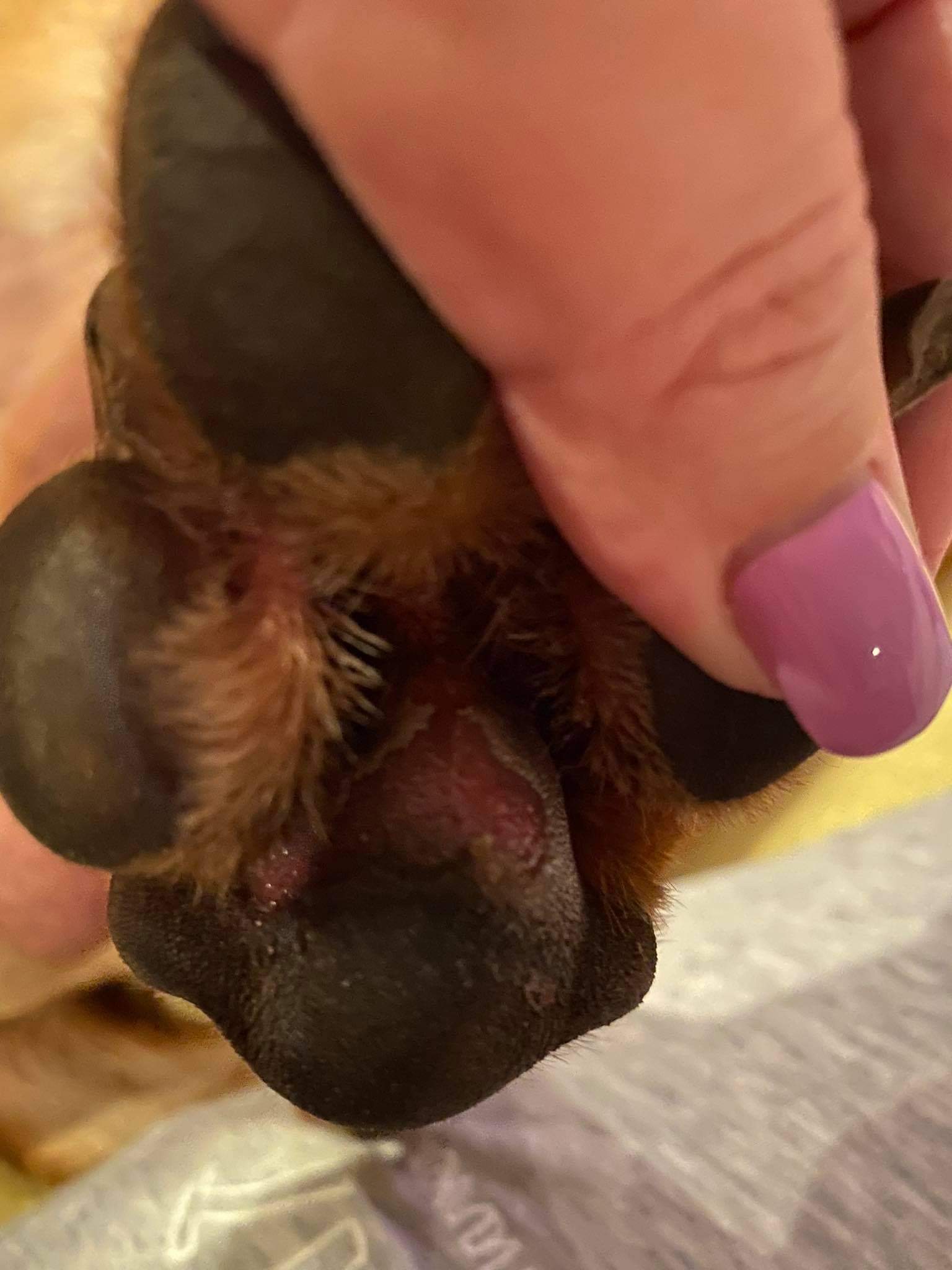 Dobrý den, neprošel se Vám pejsem po betonu nebo nějakém materiálu, který by mu mohl packu popálit? Pokud máte doma framykoin, tak mažte spíš tím a vždy packy před tím očistěte heřmánkovým odvarem. Pokud by se stav nelepšil, tak navštivte veterináře. S pozdravem MVDr. Orlovská